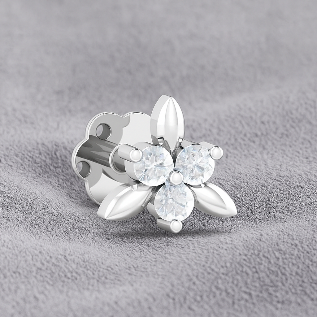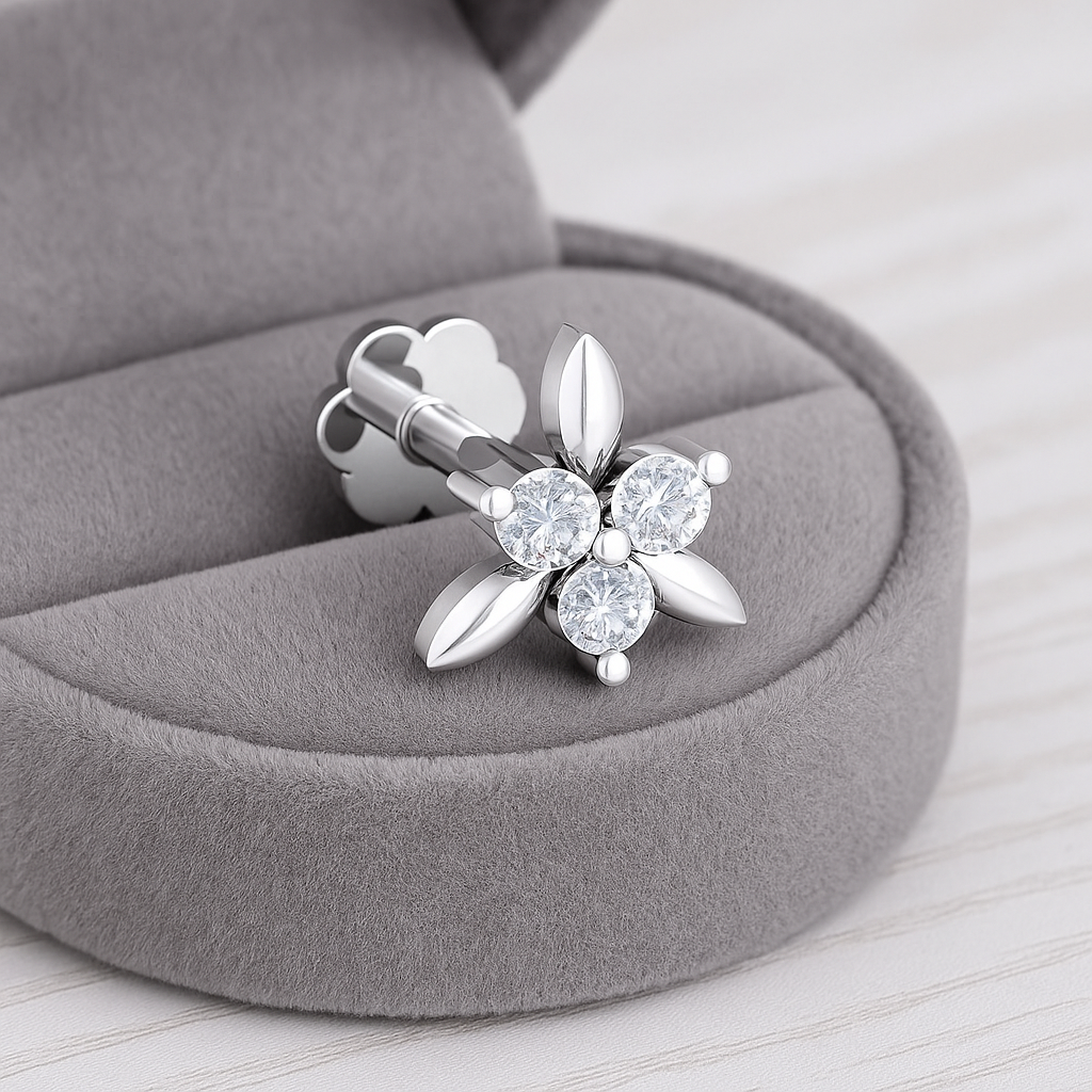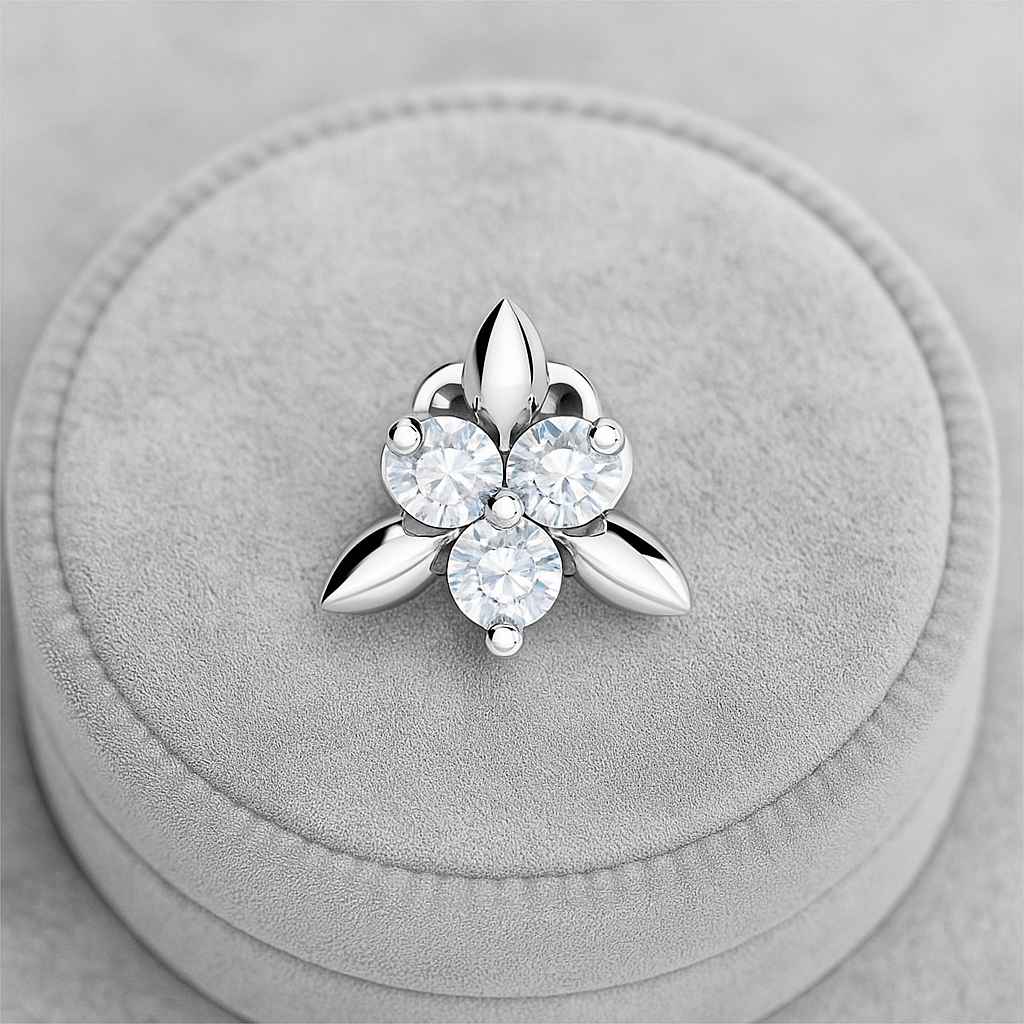 Graceful and refined, this white CZ leaf cluster nose pin is a perfect expression of natural beauty and elegance. Expertly crafted from 925 sterling silver and finished with a sleek rhodium plating, the design features a delicate trio of round white cubic zirconia stones accented by polished leaf motifs. The combination of shimmer and shine makes this piece ideal for everyday sophistication or festive glamour.