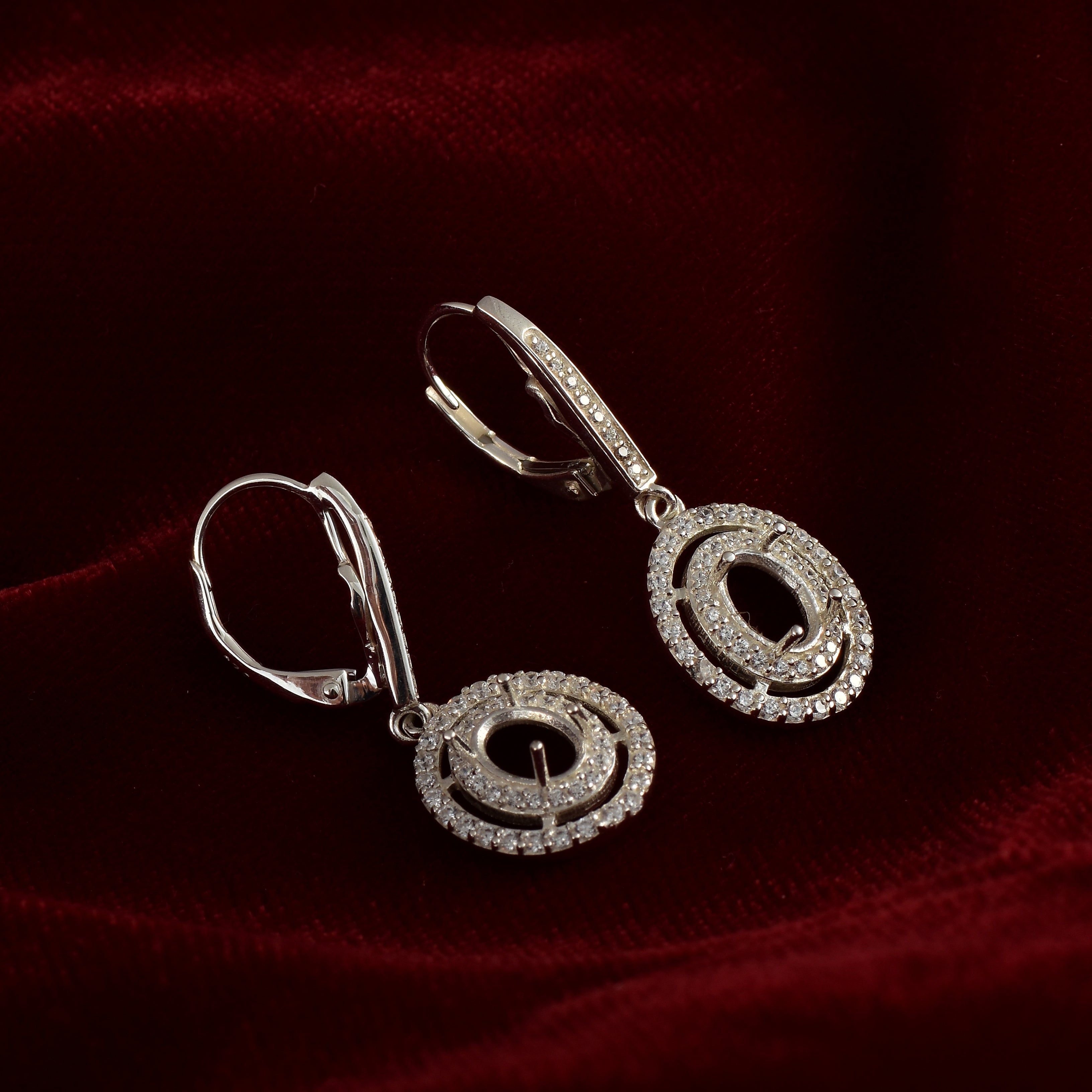 Showcase your choice of gemstone in these elegant semi-mount dangle earrings, crafted in 925 sterling silver. Designed to hold 7x5MM oval stones, each earring features a double oval halo frame encrusted with dazzling white accent stones, delivering brilliant sparkle. The secure lever-back closures and graceful drop design add a luxurious touch to these customizable earrings—perfect for creating your own personalized jewelry.