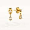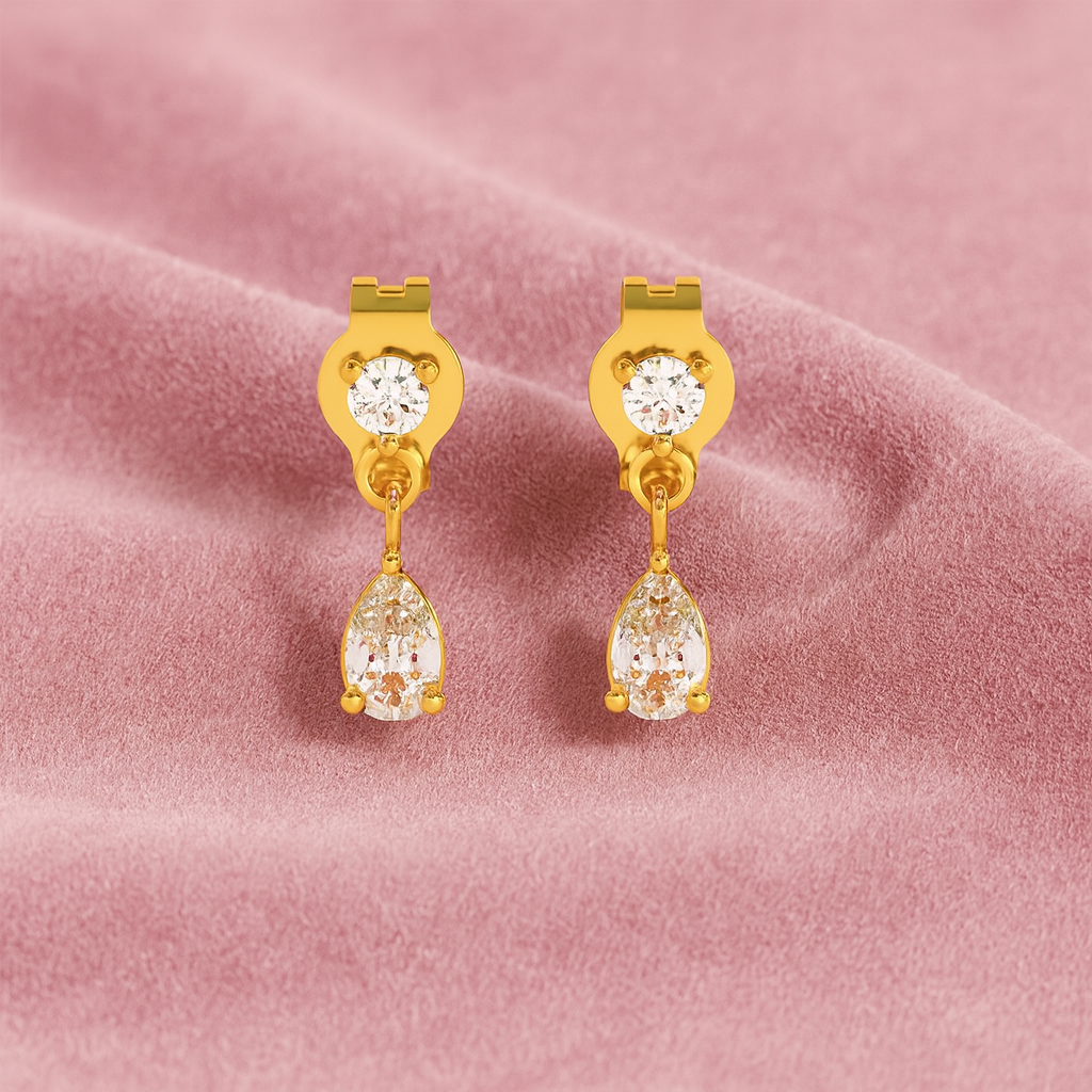 Each earring features a sparkling round-cut stone on top and a dazzling teardrop-shaped stone below, creating a graceful balance of shine and sophistication.