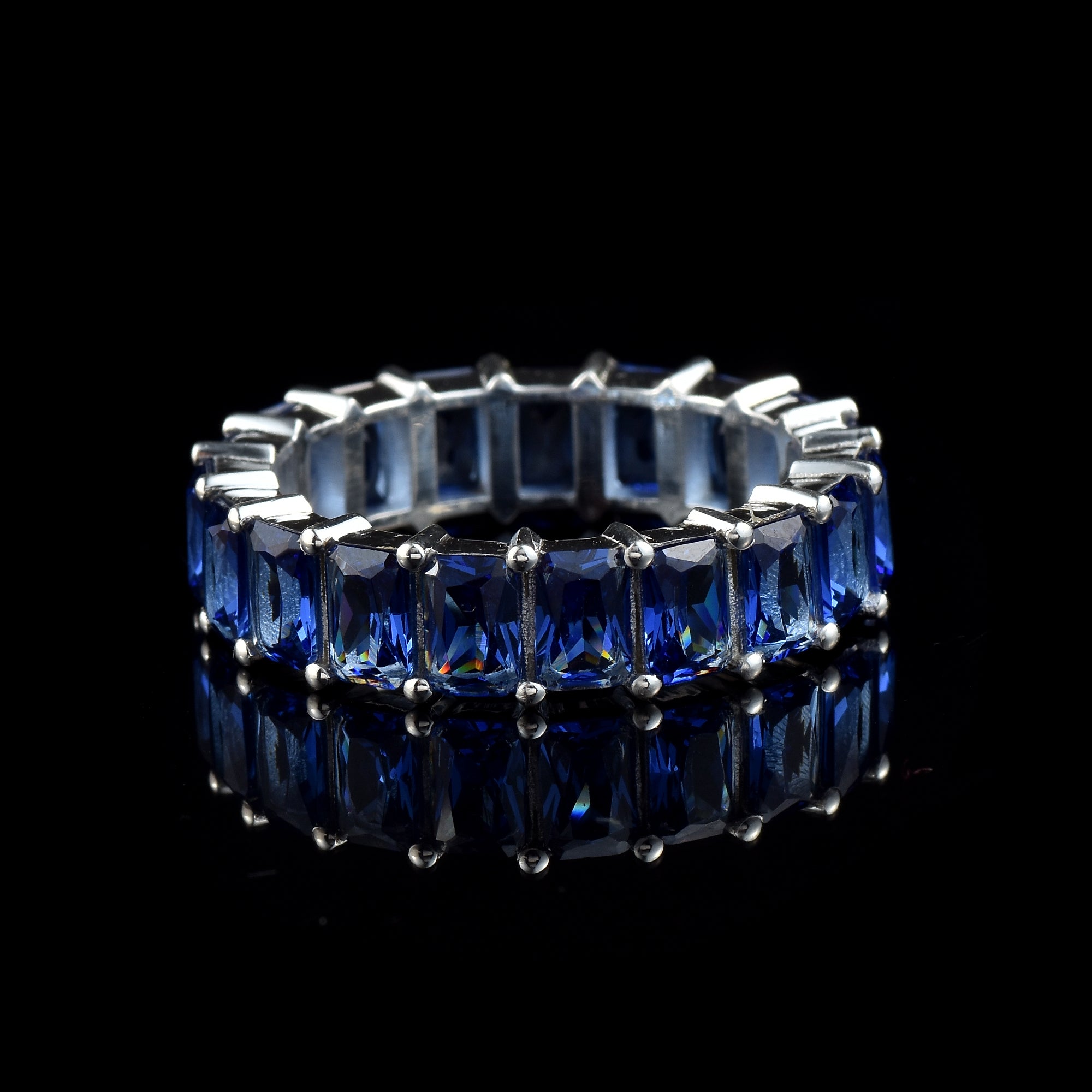 This timeless eternity band is set with a continuous row of vivid blue octagon-cut sapphires, each measuring 6 × 4 mm, for a total gemstone weight of approximately 7.50 carats. Crafted in solid 925 sterling silver, the sleek prong setting enhances the brilliance of each stone, while the deep royal blue hues create an elegant and luxurious look. Perfect as a statement piece, anniversary ring, or stacking band, this sapphire eternity ring is a striking addition to any jewelry collection.