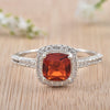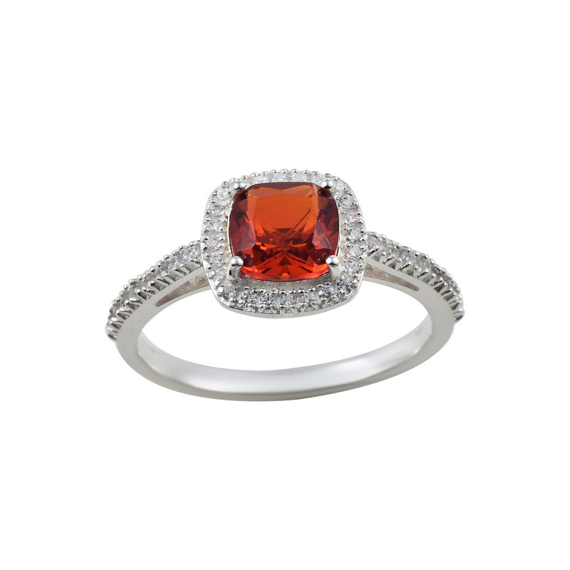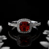 This bold and elegant ring showcases a fiery 8x8mm cushion-cut garnet, framed by a halo of shimmering cubic zirconia and set on a sterling silver band with delicate accent stones. The deep red of garnet symbolizes passion and strength, making it a meaningful January birthstone ring, engagement alternative, or special occasion gift. A striking piece that blends timeless style with vibrant color.