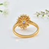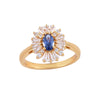 Make a dazzling impression with this elegant sunburst halo ring, showcasing a captivating 6x4mm oval-cut tanzanite at its center. The vibrant violet-blue gemstone is encircled by an intricate halo of baguette and round-cut white stones, radiating brilliance like the sun. Crafted in a polished gold-plated band, this statement ring is perfect for special occasions or adding luxury to your everyday look.