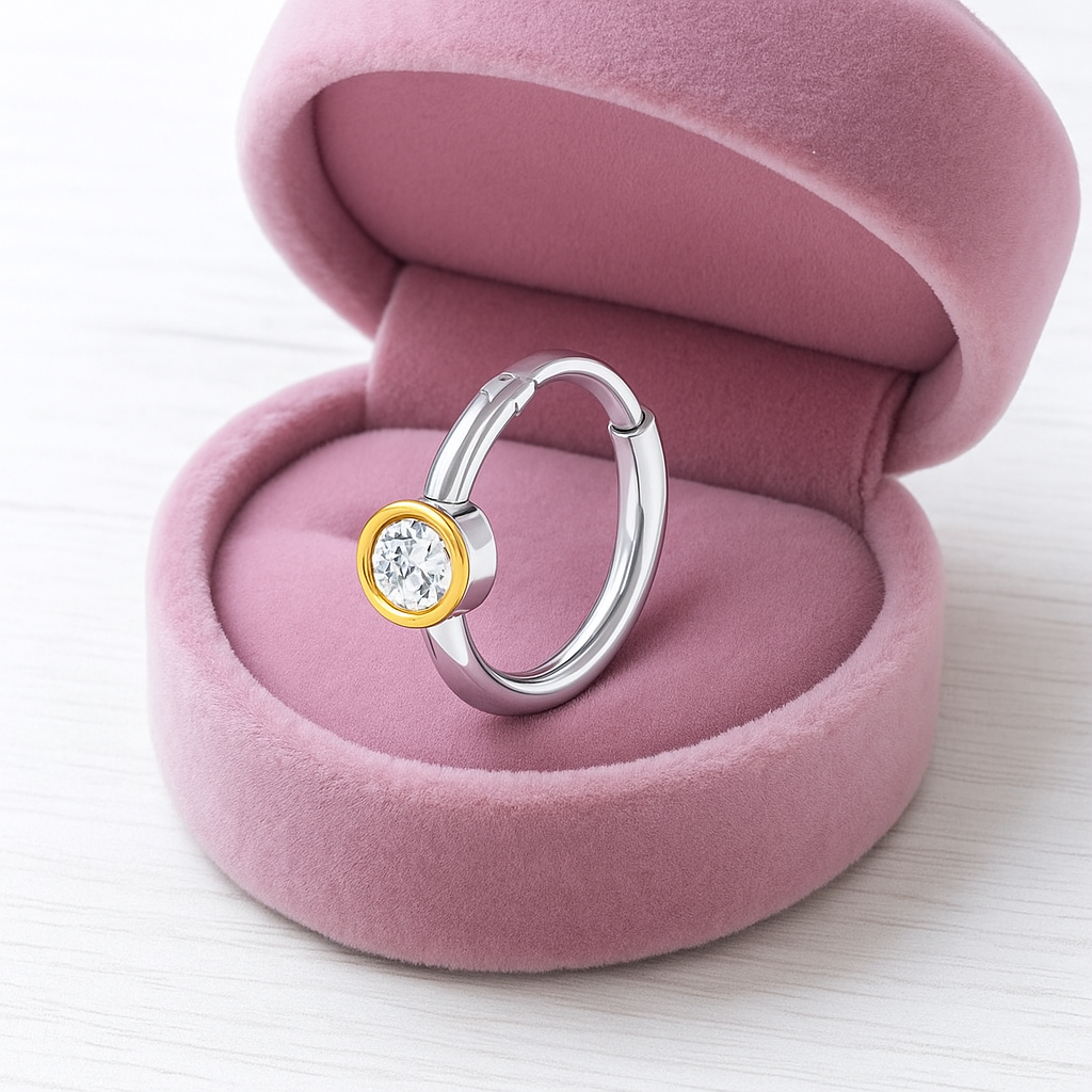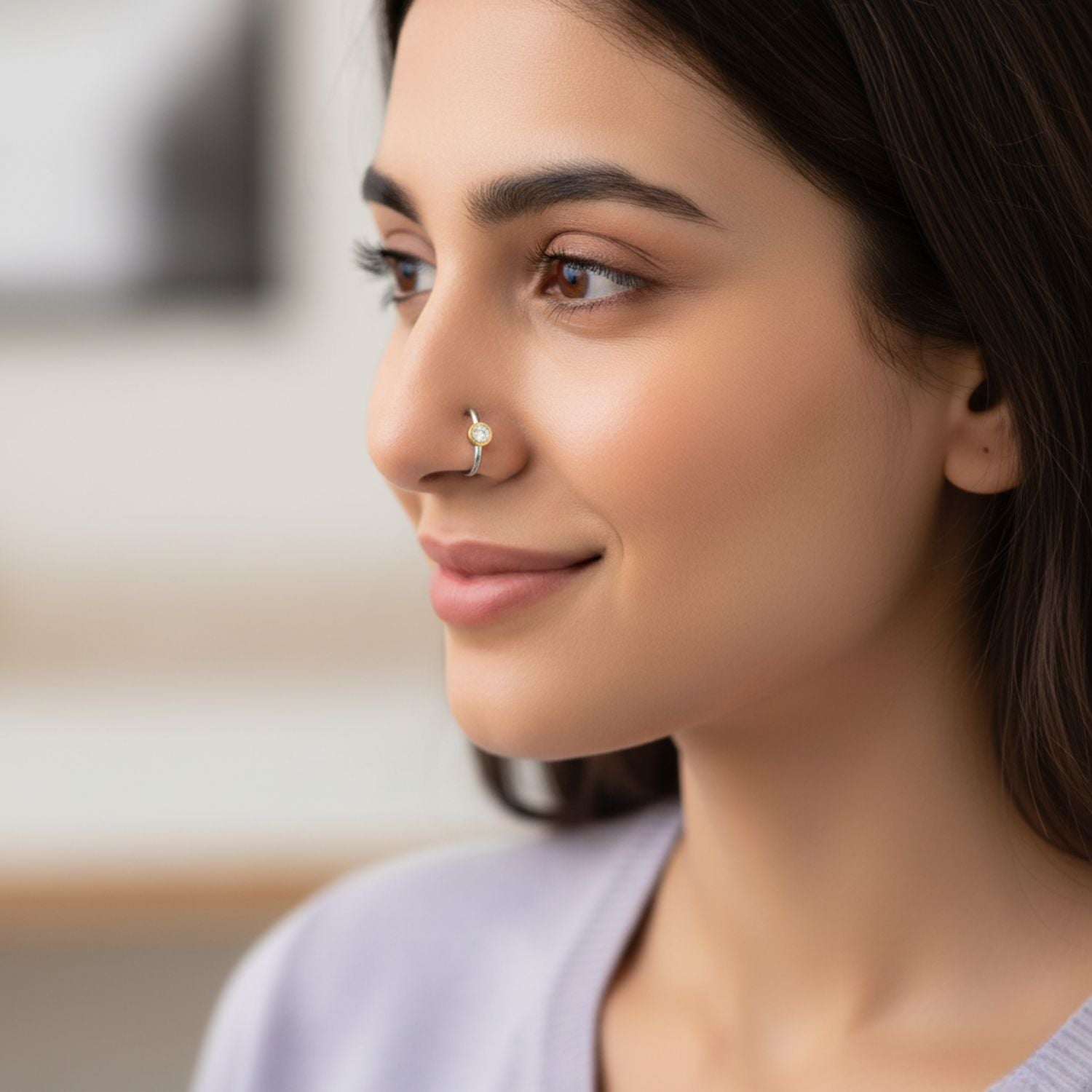 Add a hint of sophistication to your look with this sleek Bezel Set CZ Nose Pin. Expertly crafted from genuine 925 sterling silver, the design features a sparkling round-cut cubic zirconia stone secured in a rich yellow gold bezel setting. The contrast of silver and gold tones offers a modern yet elegant appeal, making it perfect for both everyday wear and special occasions.
