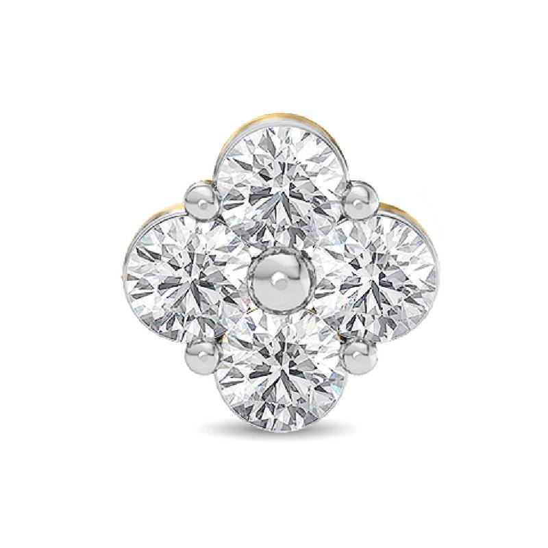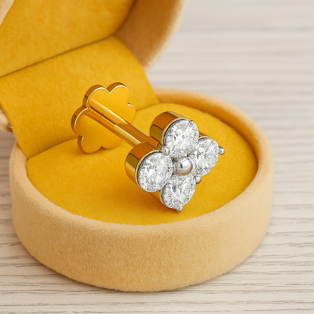Discover timeless elegance with this beautifully crafted four-petal CZ nose pin, designed to bring effortless sparkle to your look. Each petal features a perfectly set round white cubic zirconia, forming a delicate floral cluster at the center. The stones are secured in a smooth, high-polish setting that blends silver rhodium detailing with yellow gold plating, giving the piece a luxurious two-tone finish.