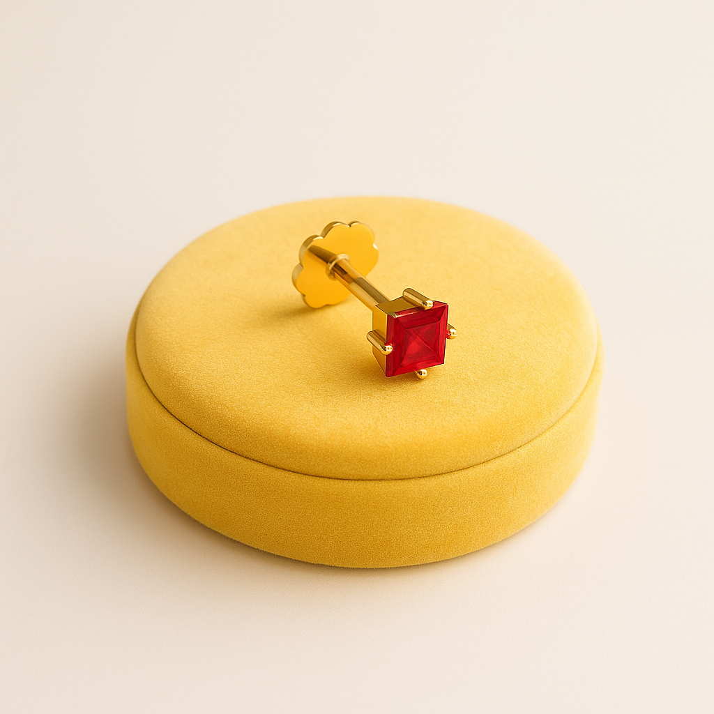 Add a bold pop of color to your style with this stunning red cubic zirconia nose pin. Crafted from high-quality 925 sterling silver and coated with luxurious yellow gold plating, this design features a perfectly cut square-shaped red CZ stone held securely in a four-prong setting. Its simple yet striking appeal makes it ideal for both everyday wear and festive occasions, offering a perfect blend of elegance and sophistication.