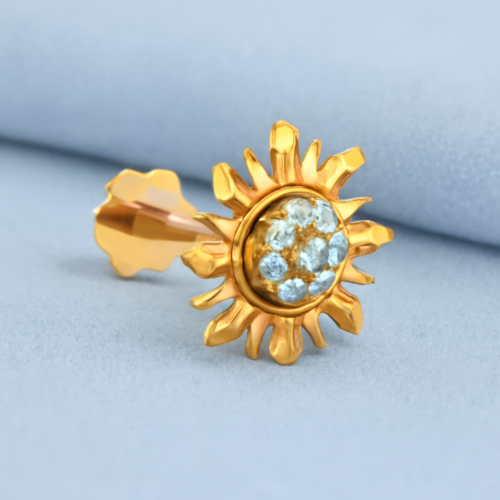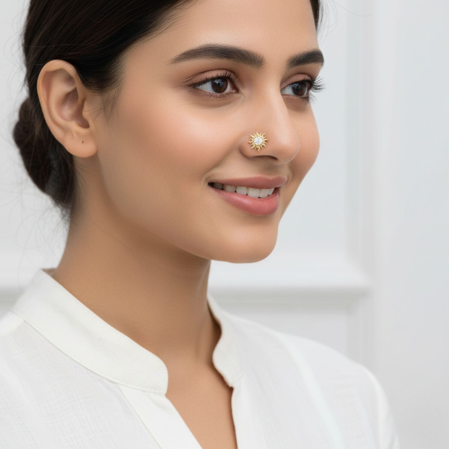 Brighten your look with this stunning sun-inspired nose pin crafted with exceptional detail. Made from premium 925 sterling silver and coated in luxurious yellow gold plating, this piece features a dazzling cluster of white cubic zirconia stones at the center, surrounded by beautifully sculpted sun rays. The high-polish finish and vibrant sparkle make it a perfect accessory for festive events, cultural occasions, or simply adding a bold touch to your everyday style. Elegant, eye-catching, and full of personality—this piece is a true standout.