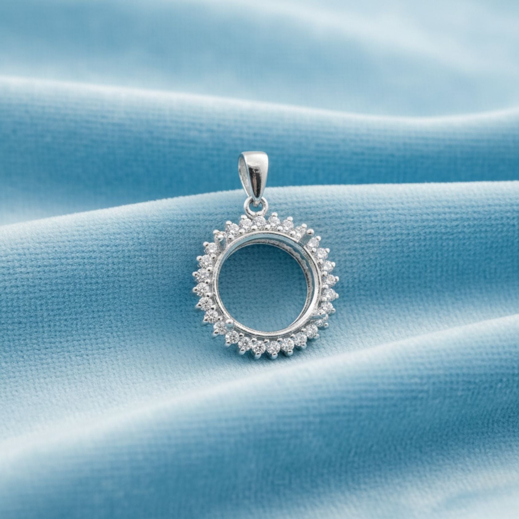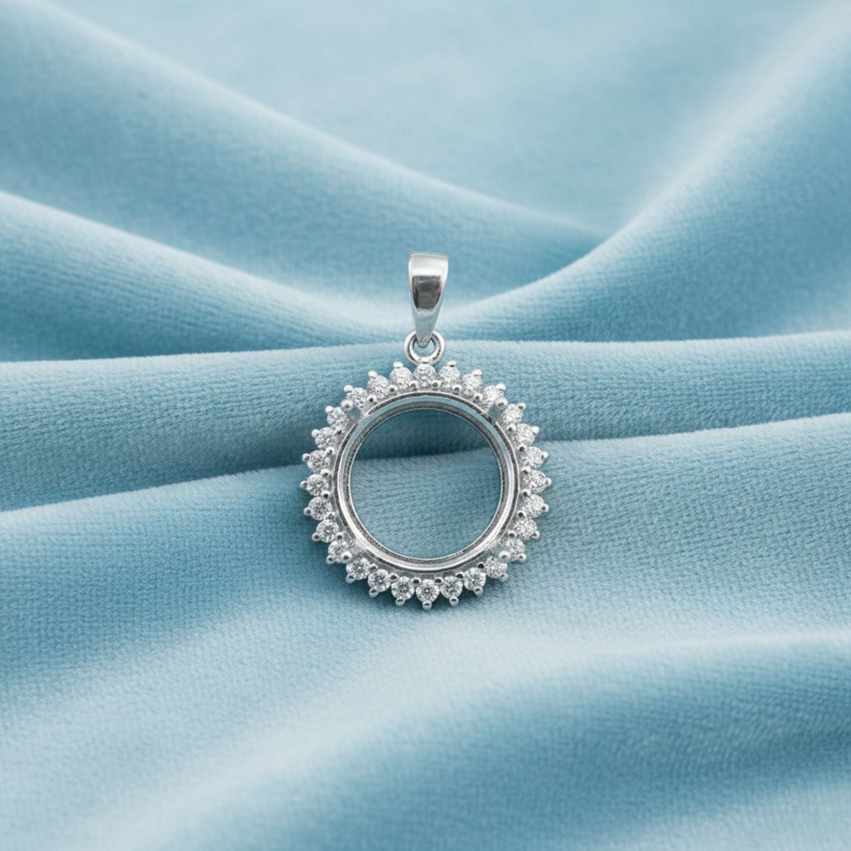 Showcase your gemstone in timeless elegance with this 10mm Round Semi Mount Pendant crafted from solid 925 sterling silver. The refined halo design features meticulously arranged accent stone mounts that add brilliance and depth once set.
