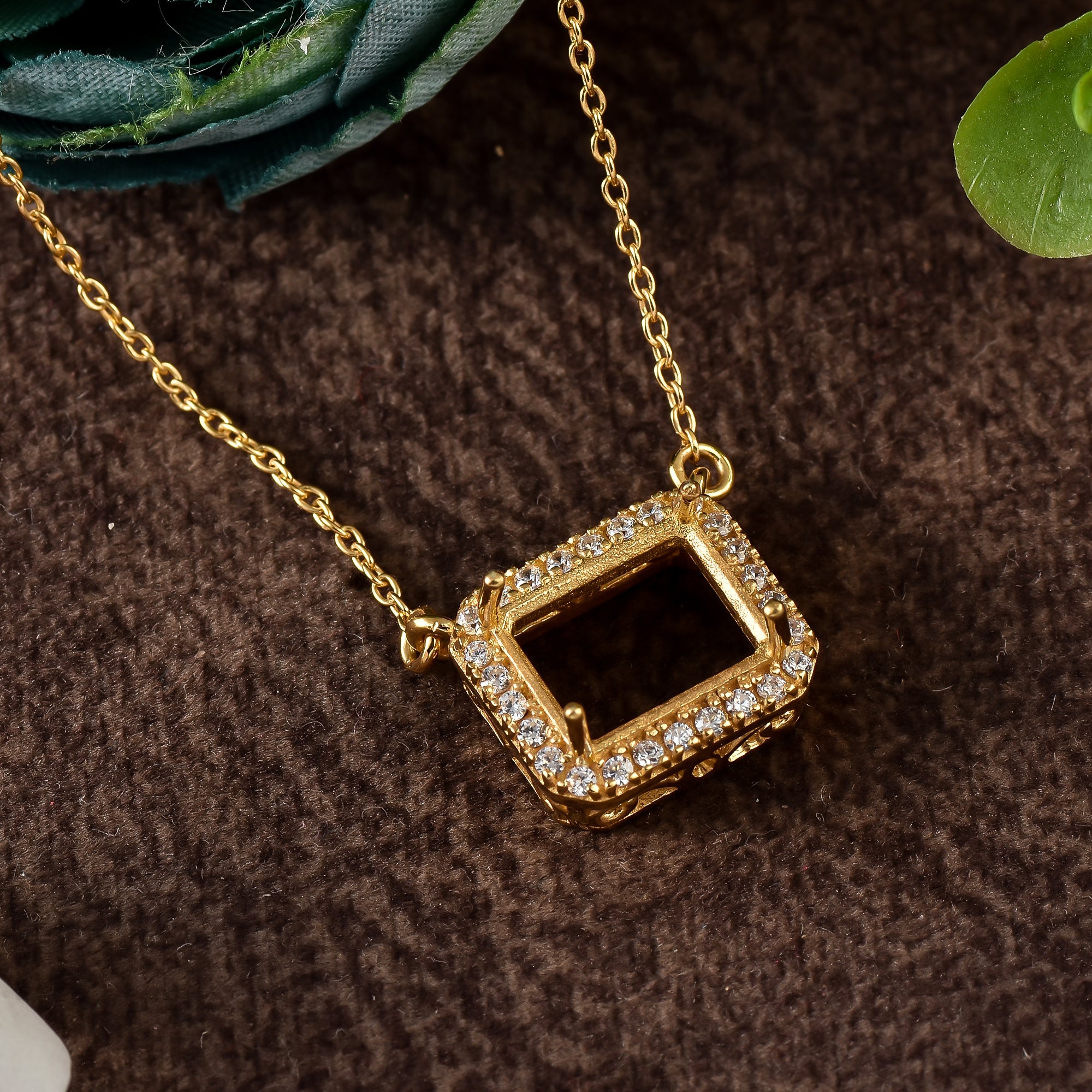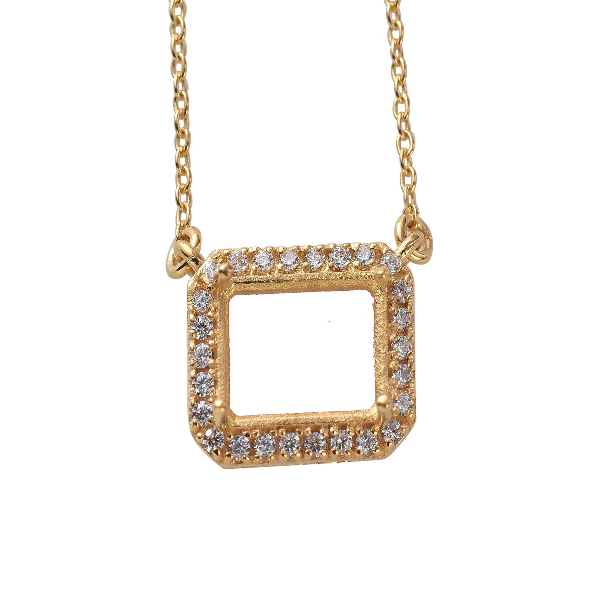 Showcase your creativity with this chic and modern semi-mount pendant, crafted in 925 sterling silver with a rich gold plating. Designed to hold a 10x8MM octagon-cut center stone, the pendant features a bold square frame bordered with sparkling round cubic zirconia stones for a refined halo effect. With its sleek geometric silhouette and elegant finish, this piece is ideal for customizing a one-of-a-kind necklace.