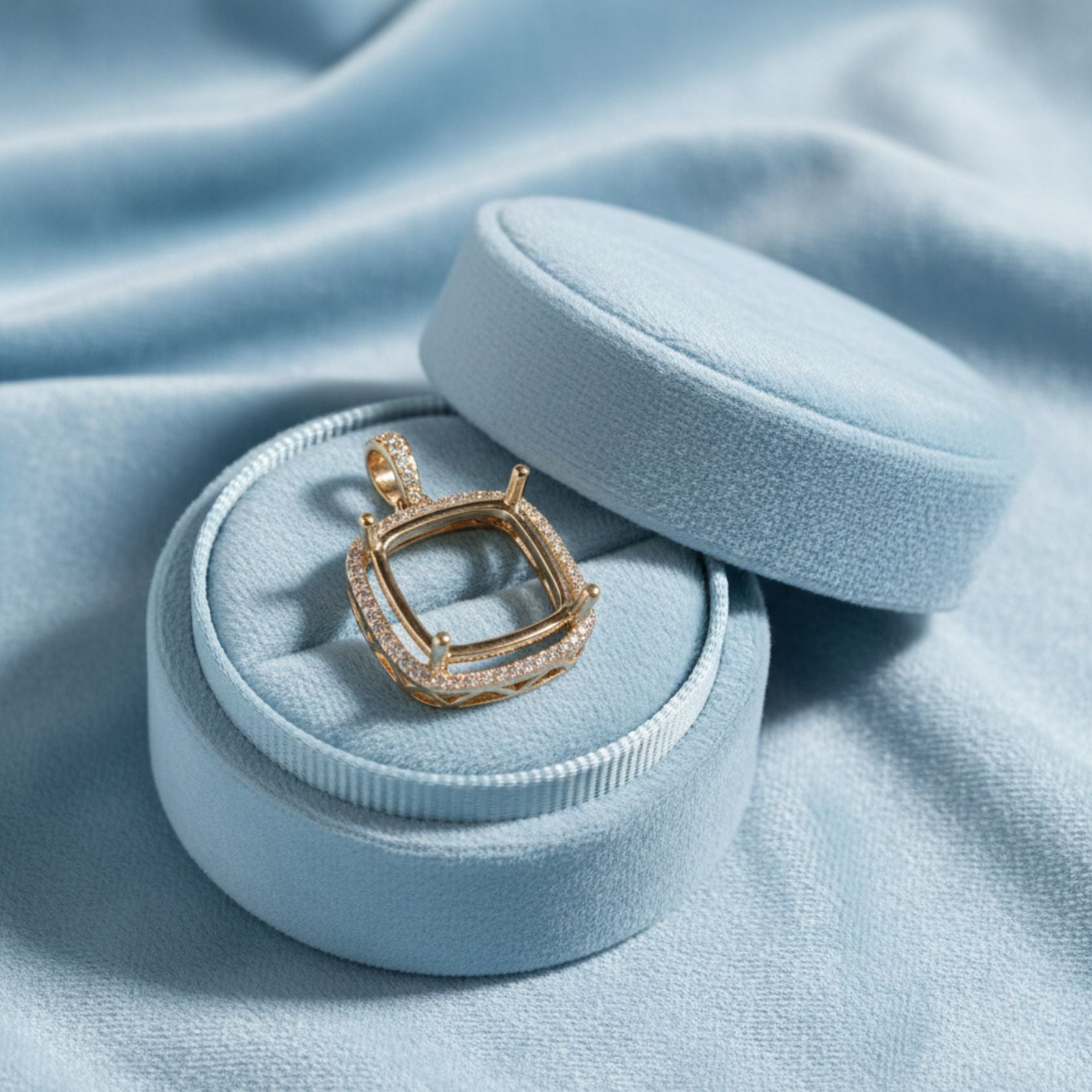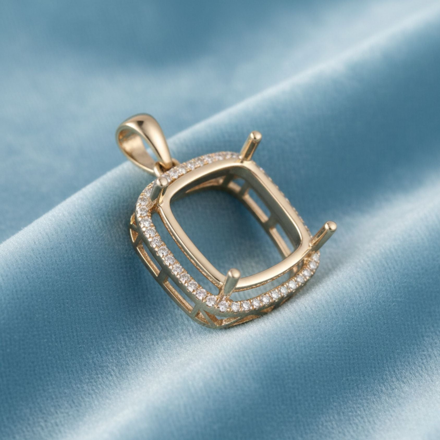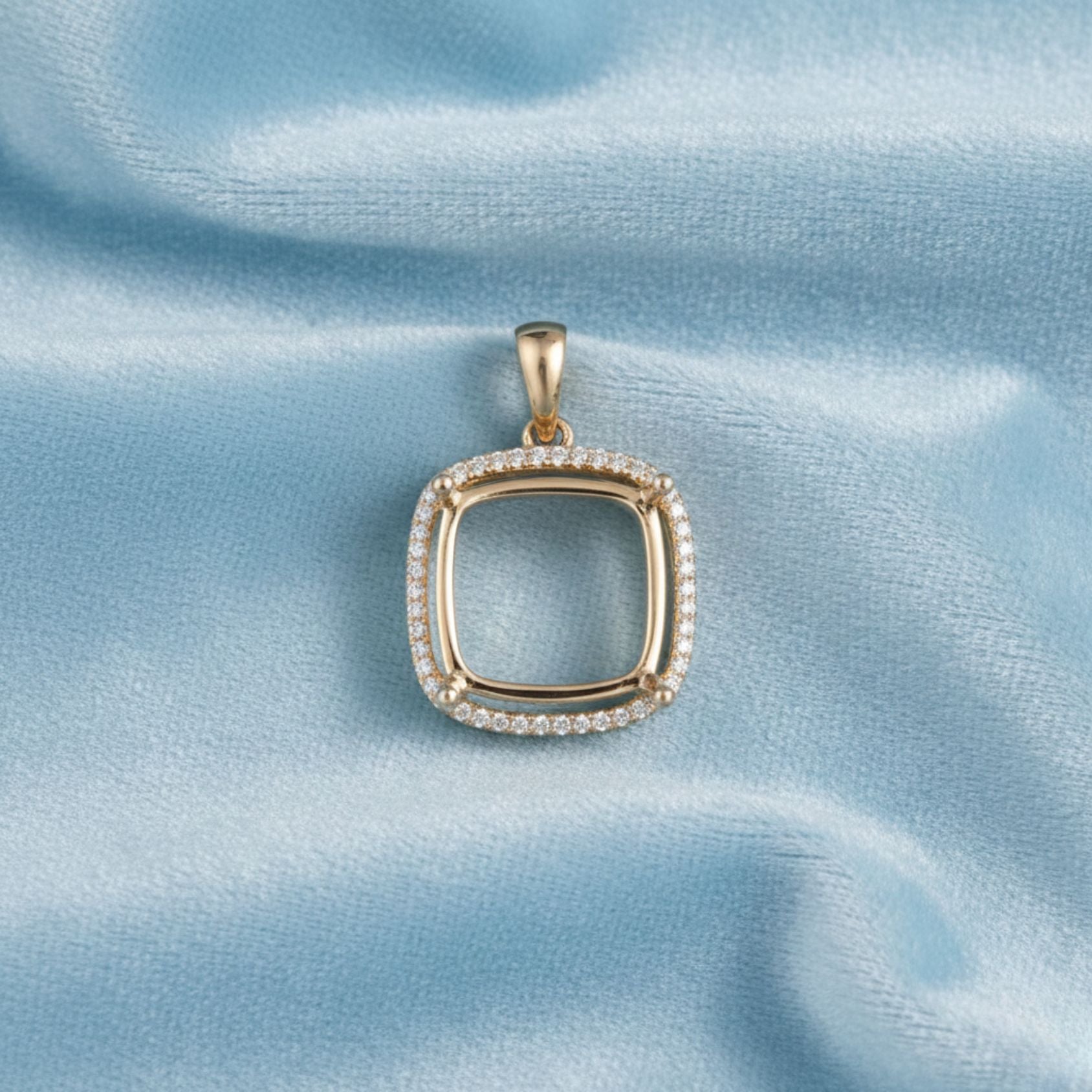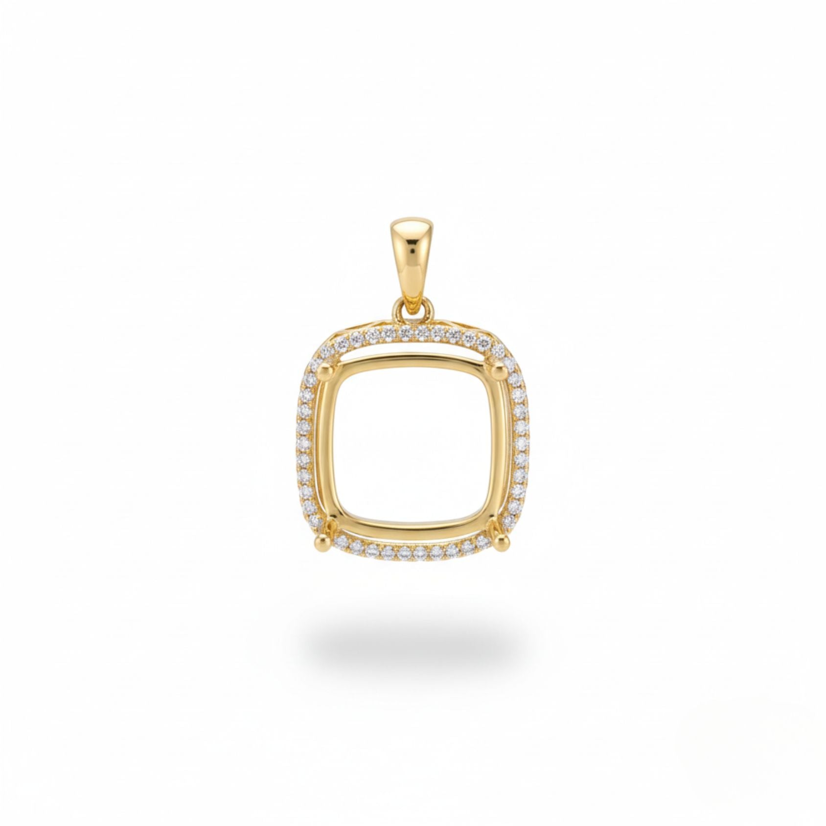 Showcase your gemstone in timeless elegance with this beautifully crafted 12mm cushion semi-mount pendant. Made from high-quality 925 sterling silver and finished with a luxurious yellow gold plating, this pendant features a dazzling halo of premium cubic zirconia stones that enhance brilliance and sparkle. Designed to securely hold a 12mm cushion-cut gemstone, its refined craftsmanship and radiant finish make it a perfect centerpiece for custom jewelry projects or meaningful gifting.