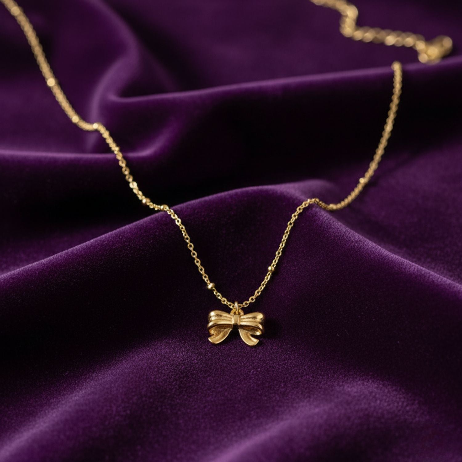 The fine chain features subtle bead detailing that enhances its charm, while the dainty bow pendant symbolizes grace and femininity.