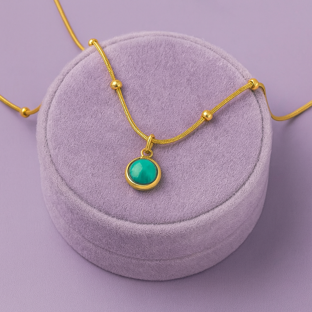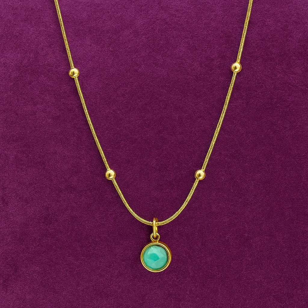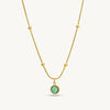 Featuring a vibrant green onyx gemstone set in a round bezel pendant, this necklace is crafted from 925 sterling silver and coated in a rich yellow gold plating. The chain is accented with tiny gold beads, offering a luxurious touch and perfect layering versatility.