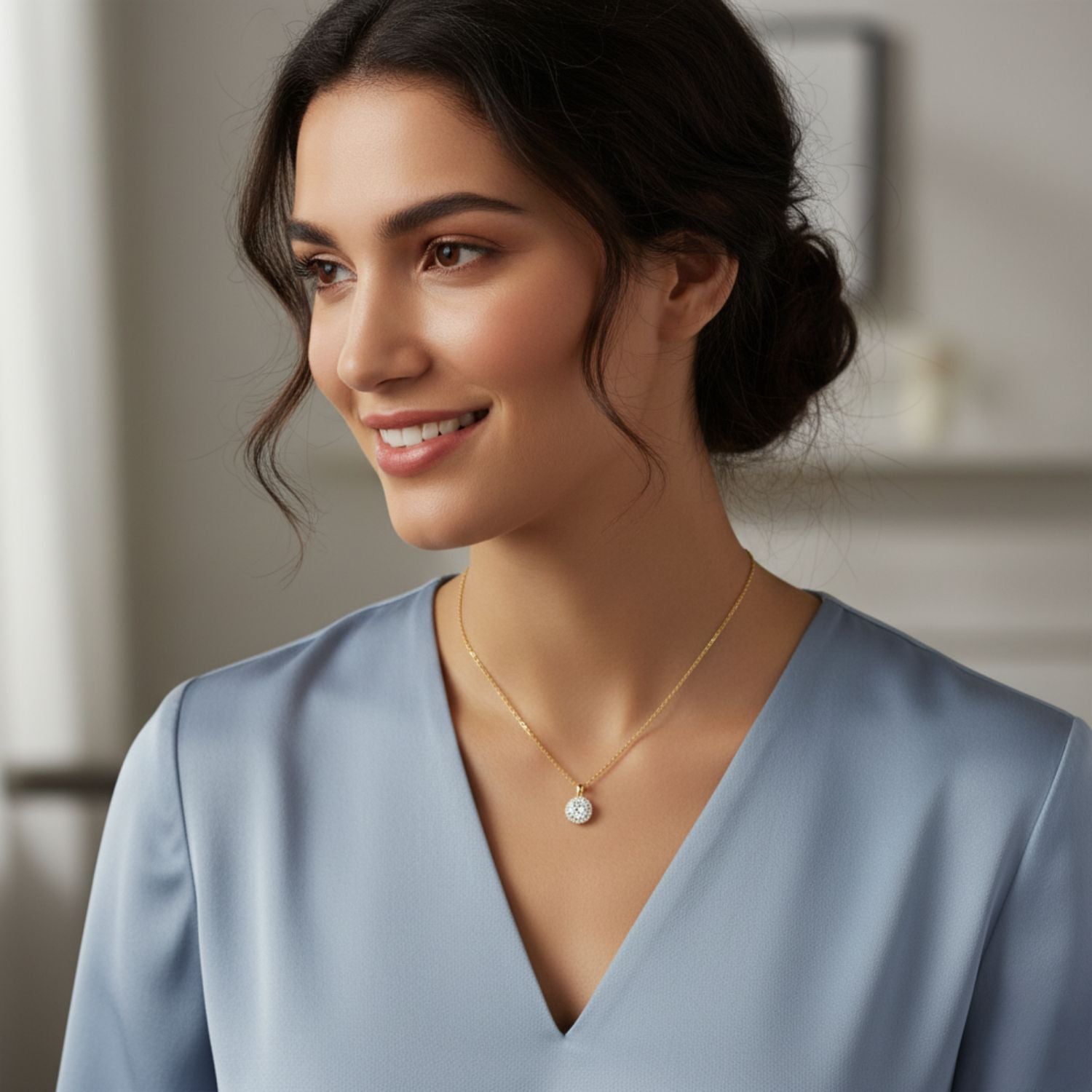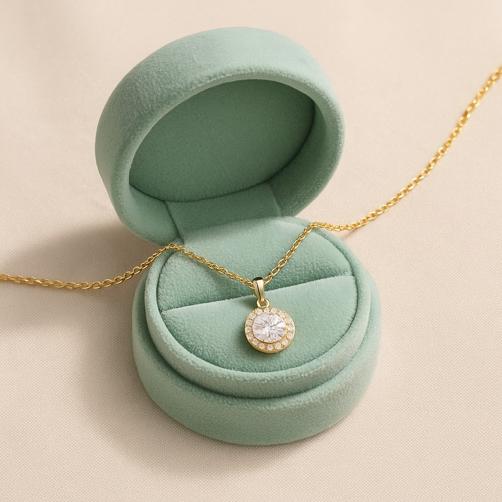 Shine with timeless beauty in this Halo Round Solitaire Necklace, meticulously crafted in 925 sterling silver and plated with luxurious yellow gold. The pendant features a brilliant round-cut cubic zirconia centerpiece surrounded by a shimmering halo of smaller stones — creating a dazzling sparkle from every angle.