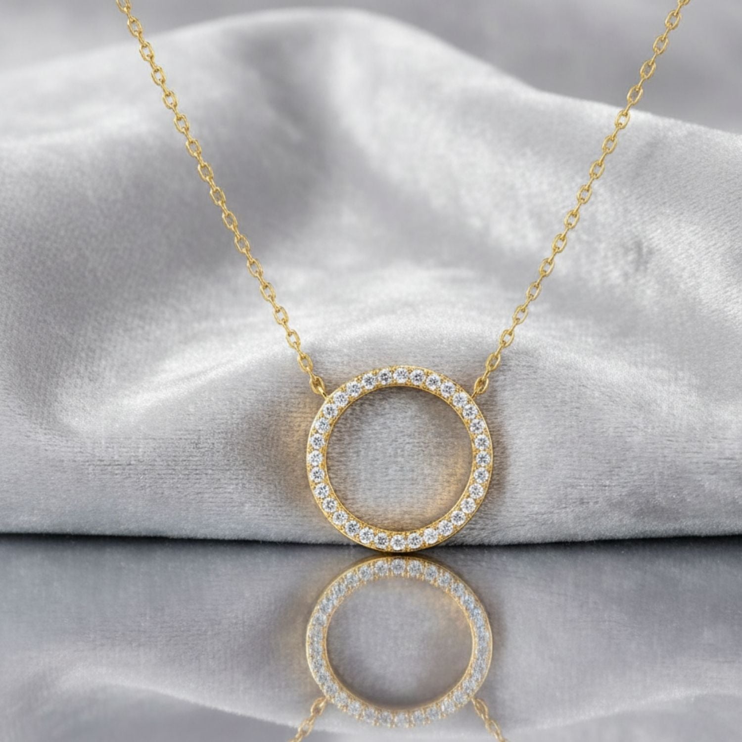 Timeless, sleek, and effortlessly elegant — this Open Circle CZ Necklace is the perfect symbol of eternity, unity, and endless style. Crafted in high-quality 925 sterling silver and finished with luxurious yellow gold plating, the pendant features a delicate open circle adorned with brilliant cubic zirconia stones for a radiant sparkle.