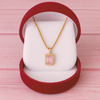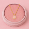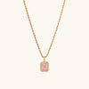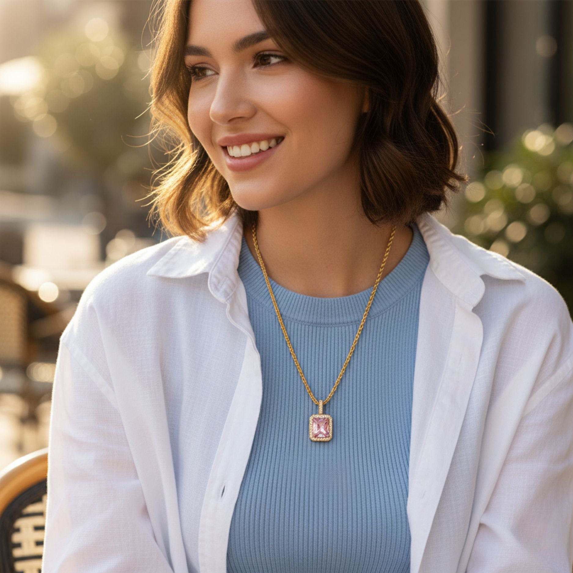 The pendant features a soft pink emerald-cut stone, beautifully framed by a halo of sparkling cubic zirconia crystals that enhance its brilliance.