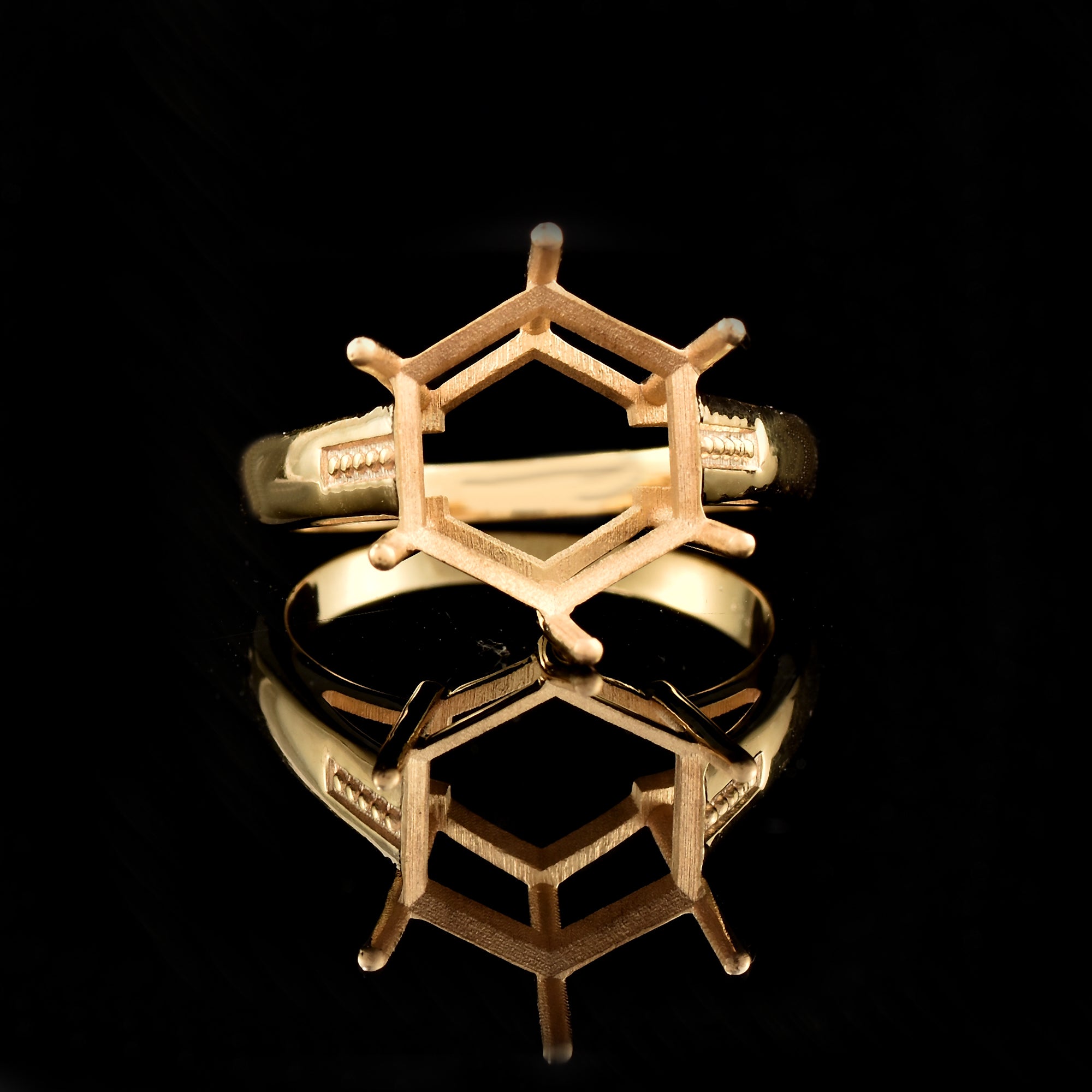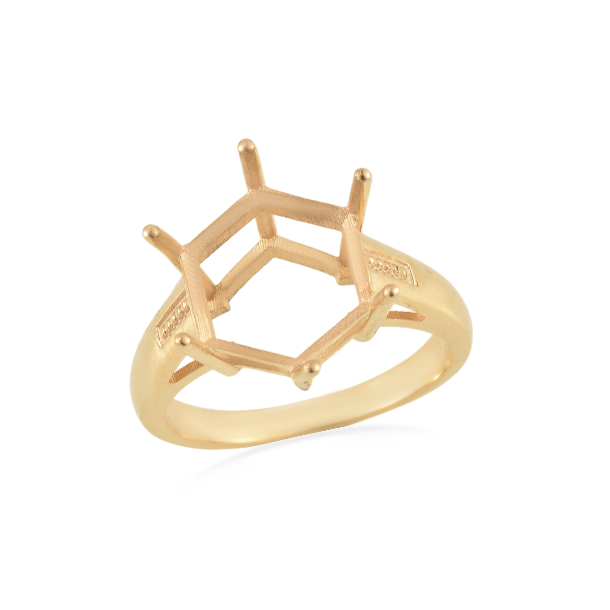 This striking Hexagon Semi Mount Ring is designed to showcase your favorite gemstone with a bold, contemporary look. Crafted in 925 sterling silver with a rich yellow gold plating, the ring features a secure 12mm hexagon-shaped prong setting, ready to accommodate a center stone of approximately 6.00 carats.