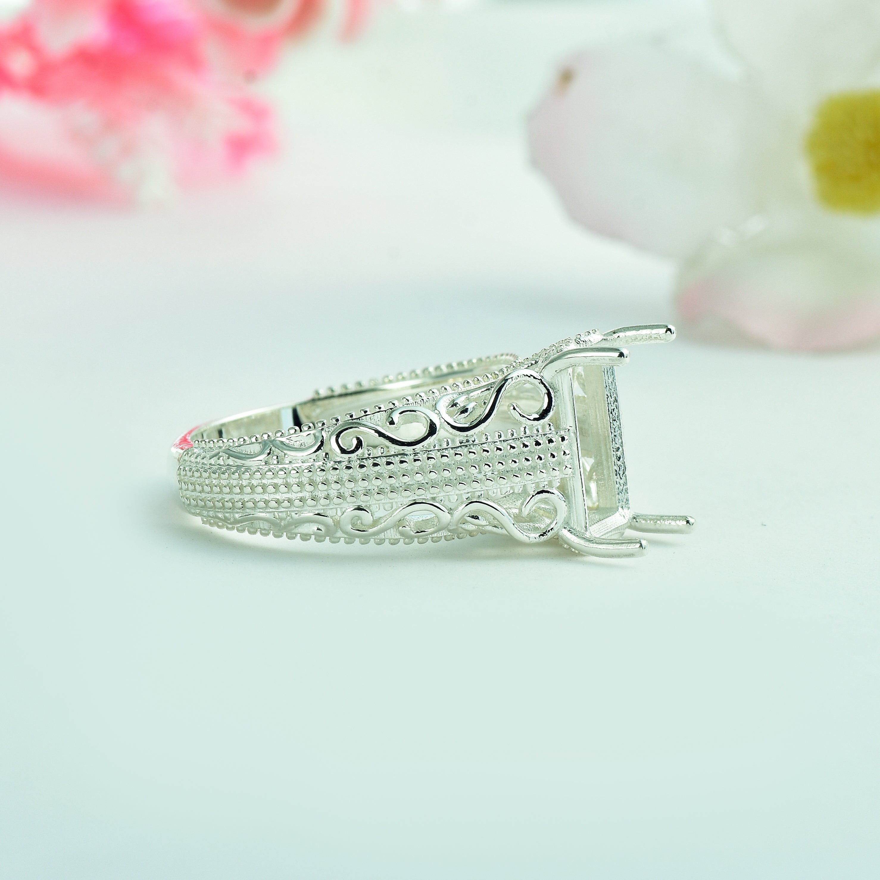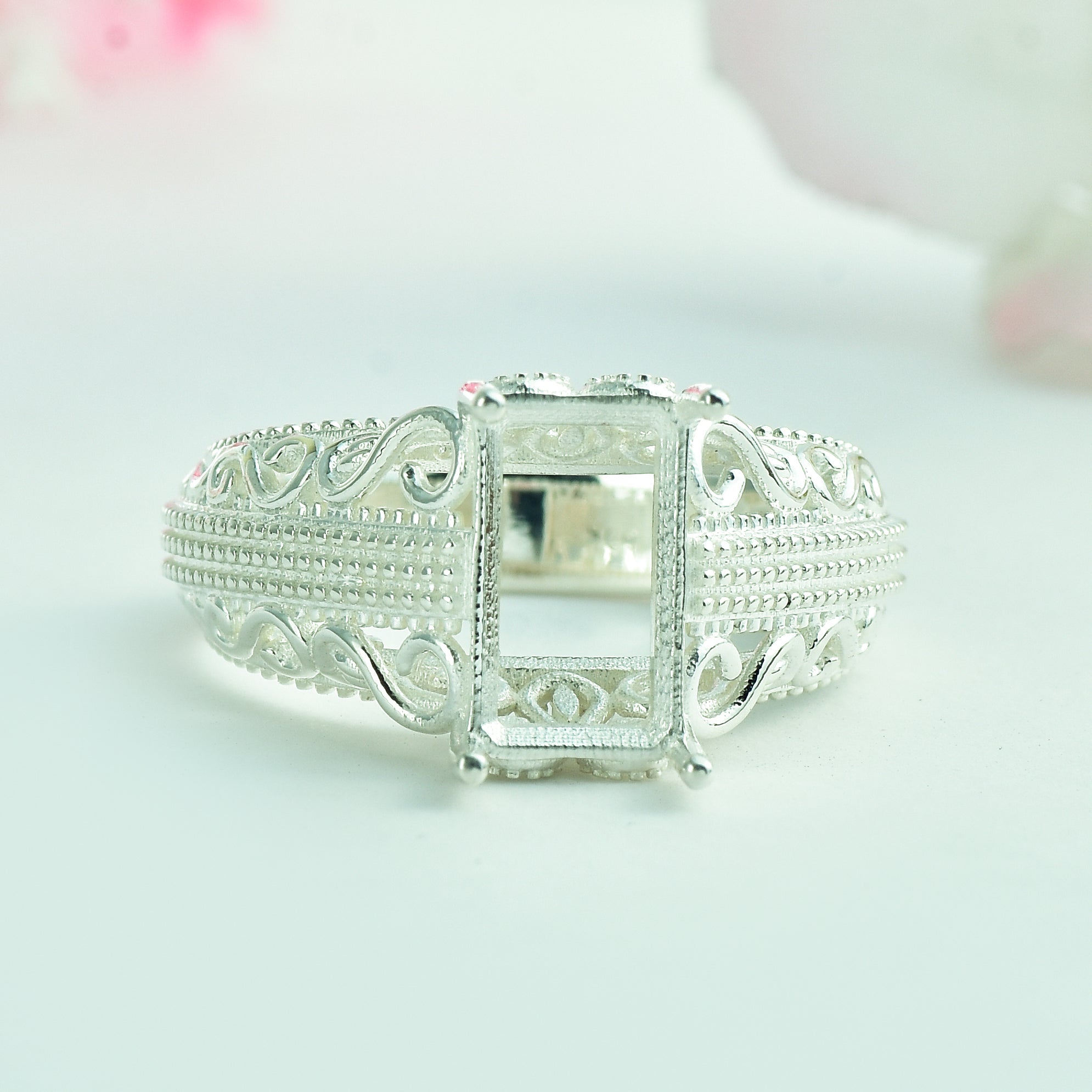 Showcase your unique gemstone in this beautifully detailed semi-mount ring, crafted in polished sterling silver. Designed to hold a 10x6mm octagon-cut stone, this setting features vintage-inspired filigree and milgrain accents for timeless elegance. The openwork scrolls and beaded edges make this a perfect choice for a one-of-a-kind engagement or heirloom-quality piece.