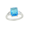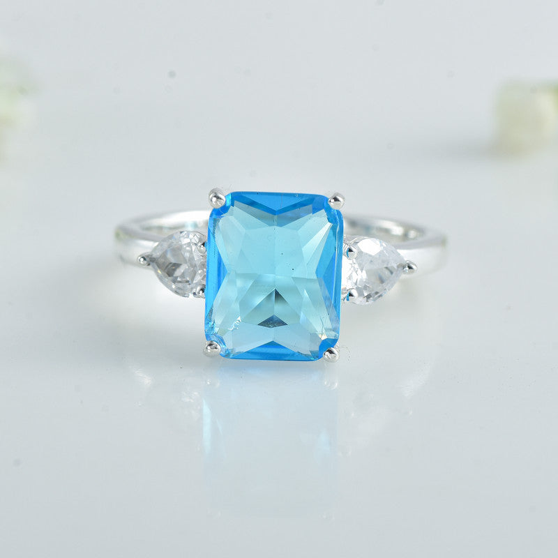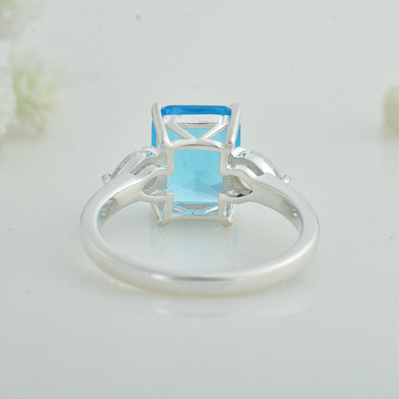 A stunning statement of color and brilliance, this ring features a 10x8mm octagon-cut Swiss blue topaz at its center, radiating a refreshing ocean-blue hue. The bold centerpiece is complemented by two pear-shaped white accent stones, adding sparkle and sophistication to the design.