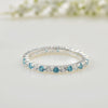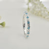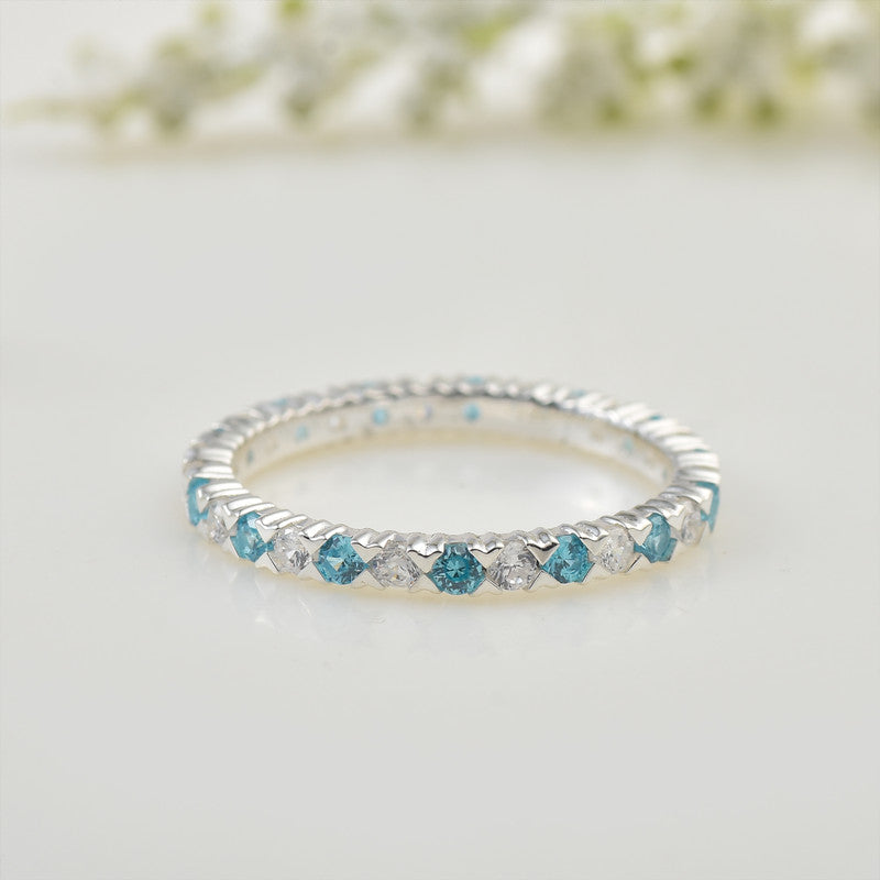 This delicate eternity band features alternating 2x2mm round-cut aquamarine and sparkling white cubic zirconia stones, set seamlessly in polished sterling silver. The serene ocean-blue of aquamarine paired with dazzling CZ creates a timeless and versatile ring, perfect for stacking, wearing alone, or as a promise/anniversary band. Lightweight and elegant, it’s a must-have addition to any jewelry collection.