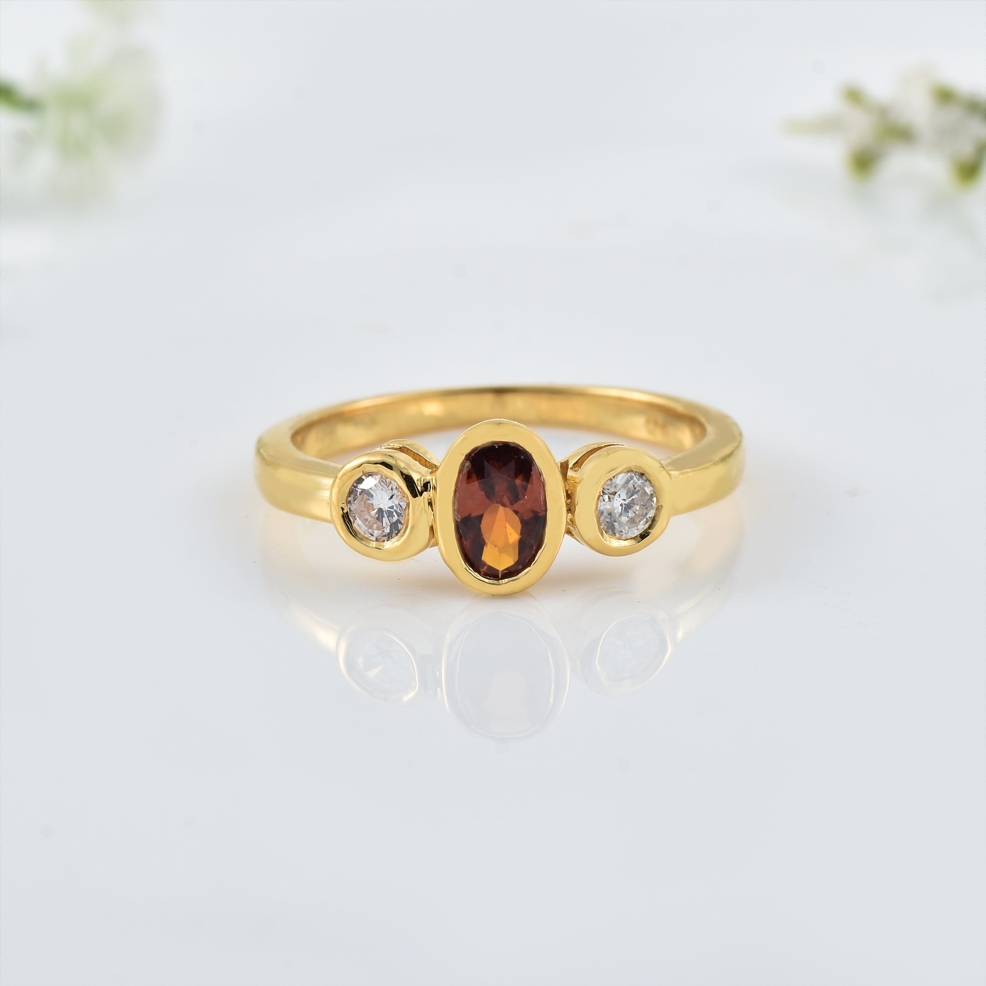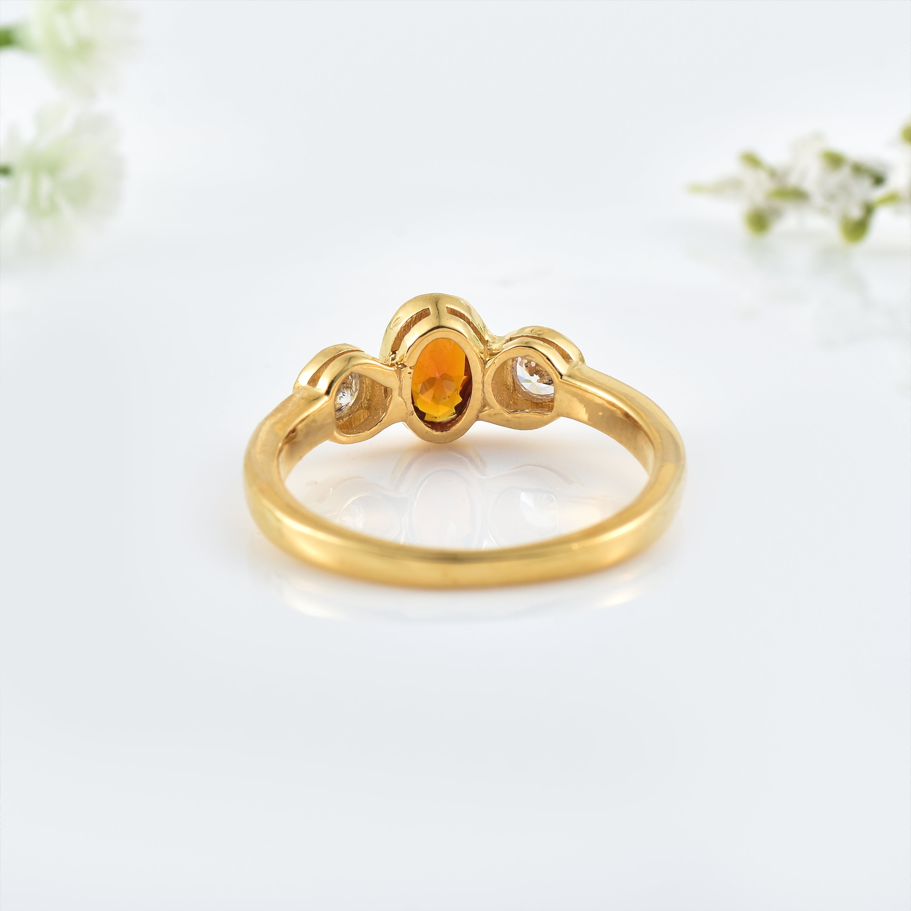 This sophisticated gold-plated ring features a warm, 6x4mm oval-cut citrine at its center, flanked by two sparkling white stones in a sleek bezel setting. The minimalist design with a touch of color makes it perfect for stacking or wearing solo as an elegant statement piece.