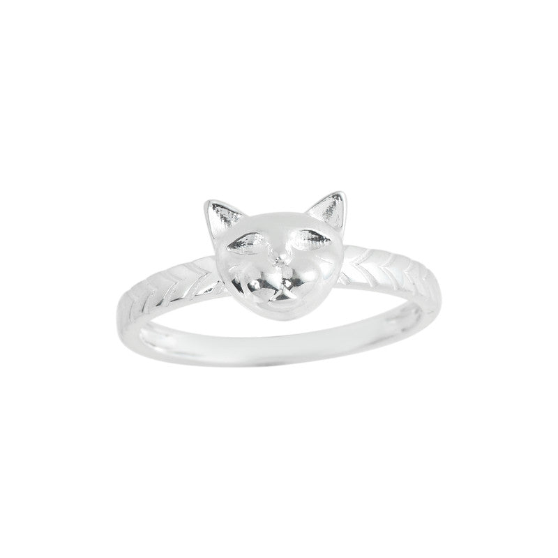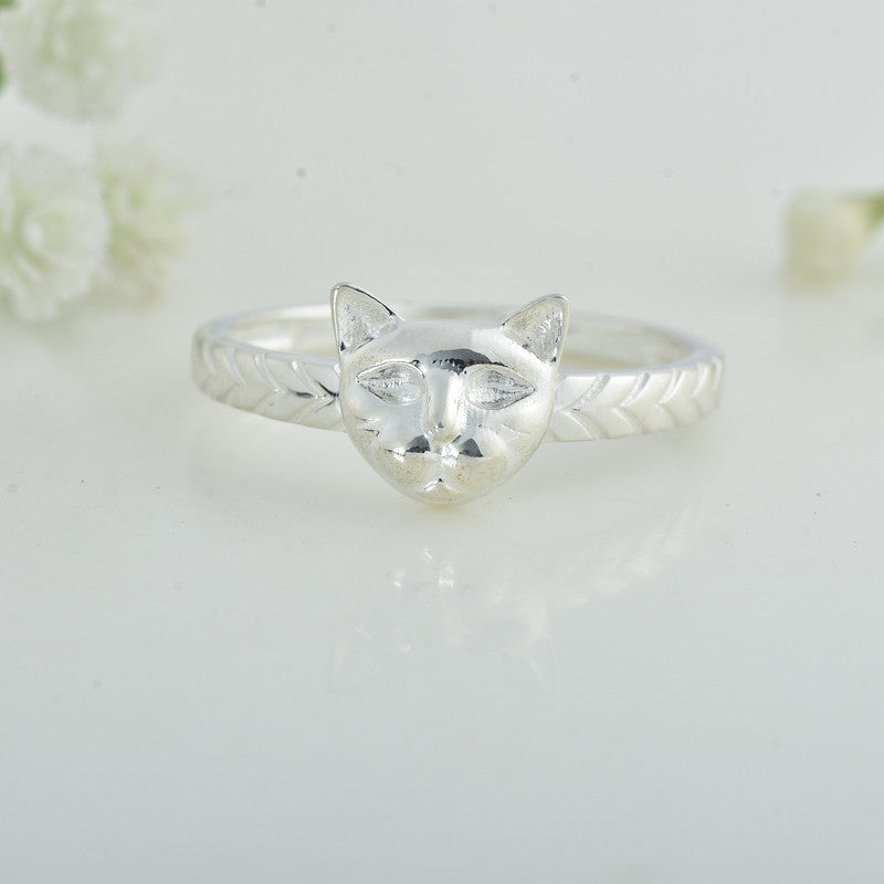 Celebrate your love for cats with this adorable sterling silver cat face ring. Featuring a polished cat head motif at the center with subtle engraving details on the band, this piece perfectly combines playful charm with sleek minimalism.
