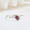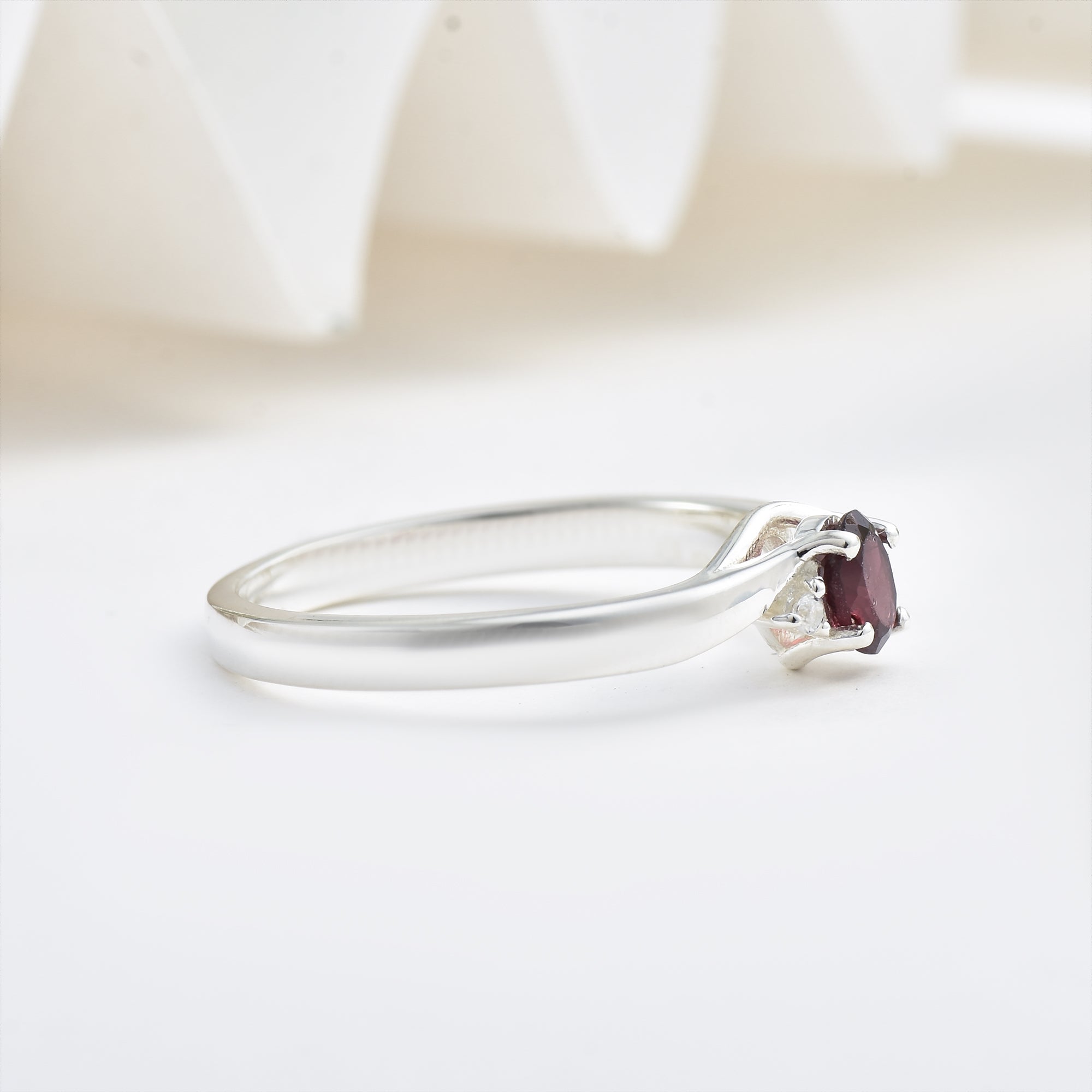 Delicate and romantic, this elegant ring features a vivid 6x4mm oval-cut rhodolite garnet as its centerpiece, flanked by subtle white accent stones. The sleek sterling silver band with a gentle twist design enhances its graceful and modern appeal — perfect for everyday wear or as a heartfelt gift.
