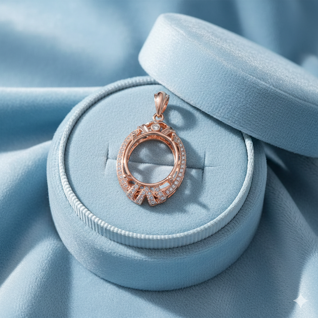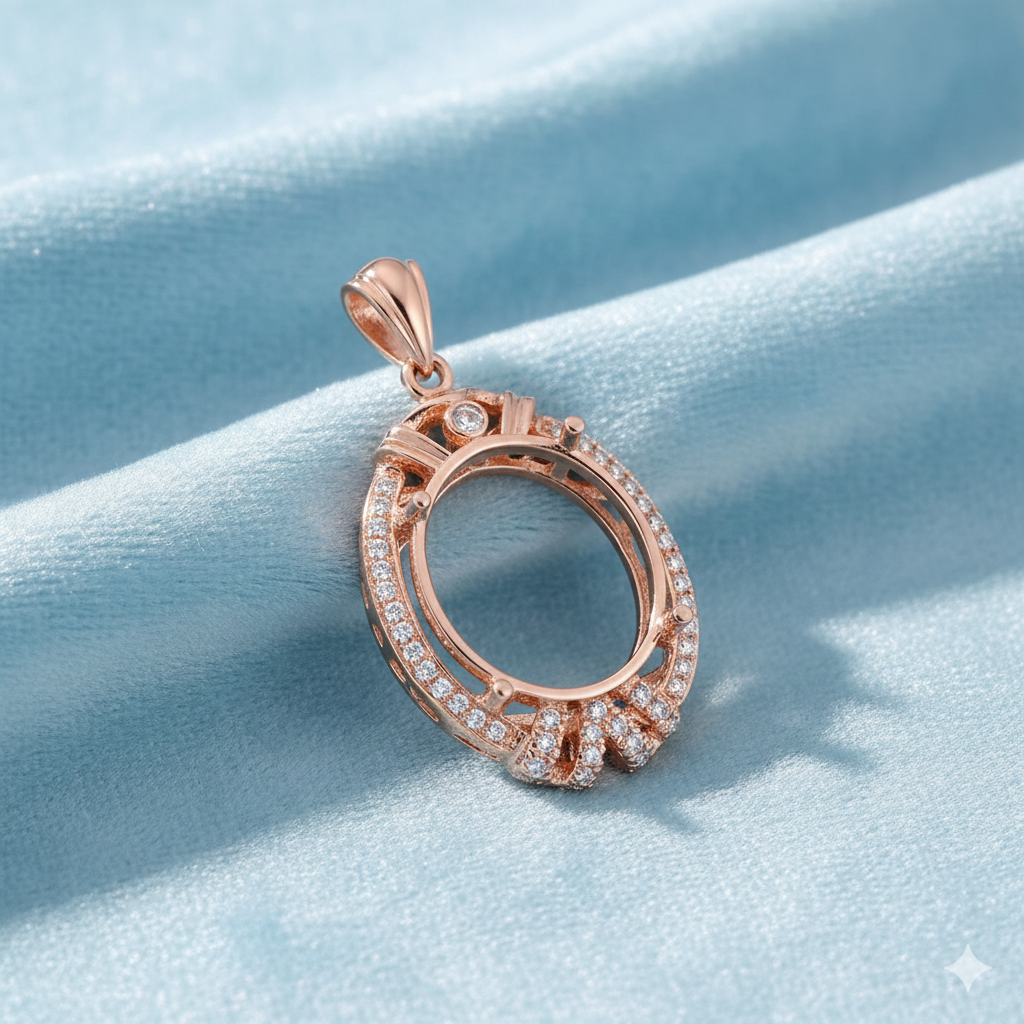 Elevate your jewelry design with this elegant 925 sterling silver semi mount pendant, beautifully plated in rose gold. Designed to hold a 13x11mm oval-cut gemstone, this pendant features a sparkling CZ halo, delicate filigree work, and a bezel-set accent stone at the top for added brilliance.