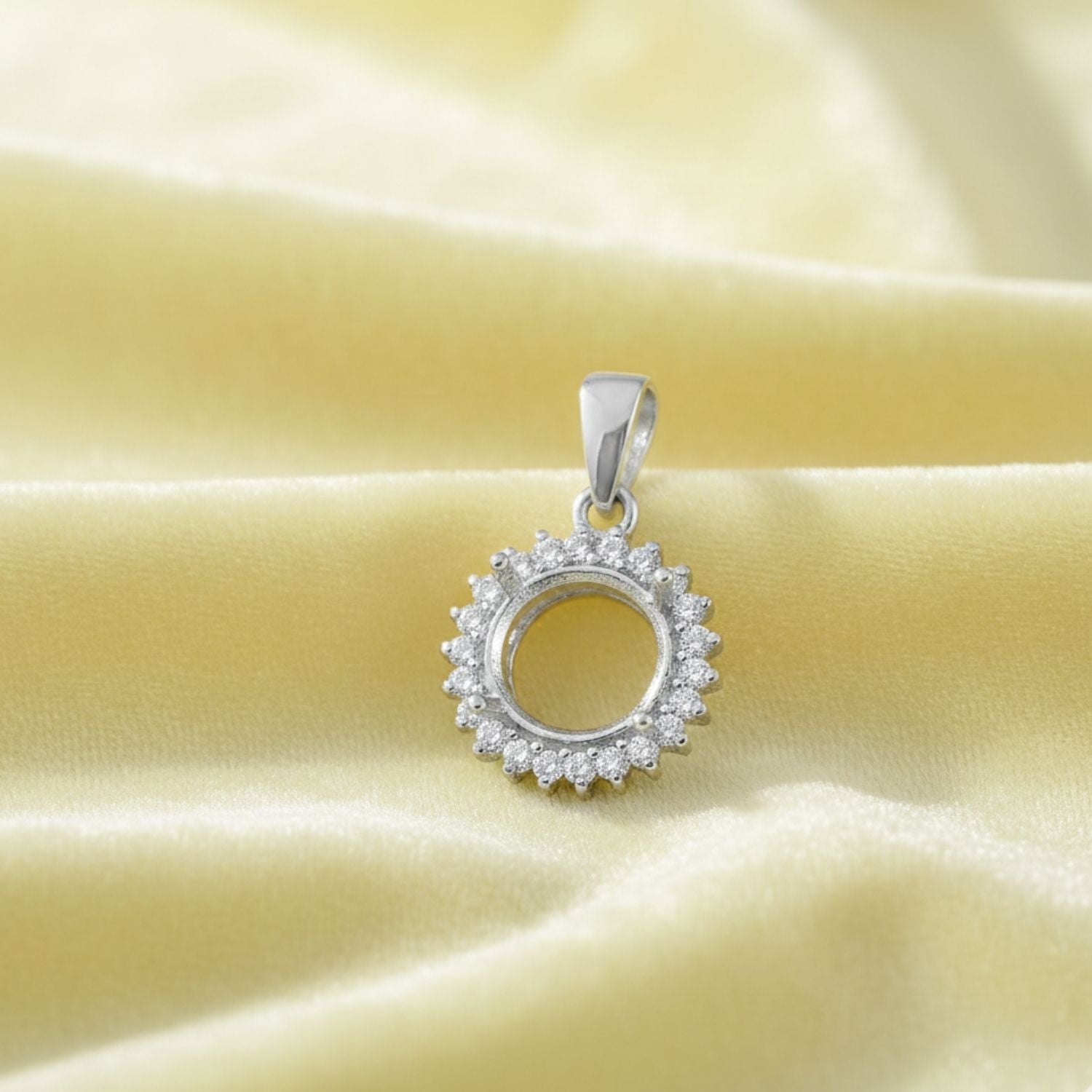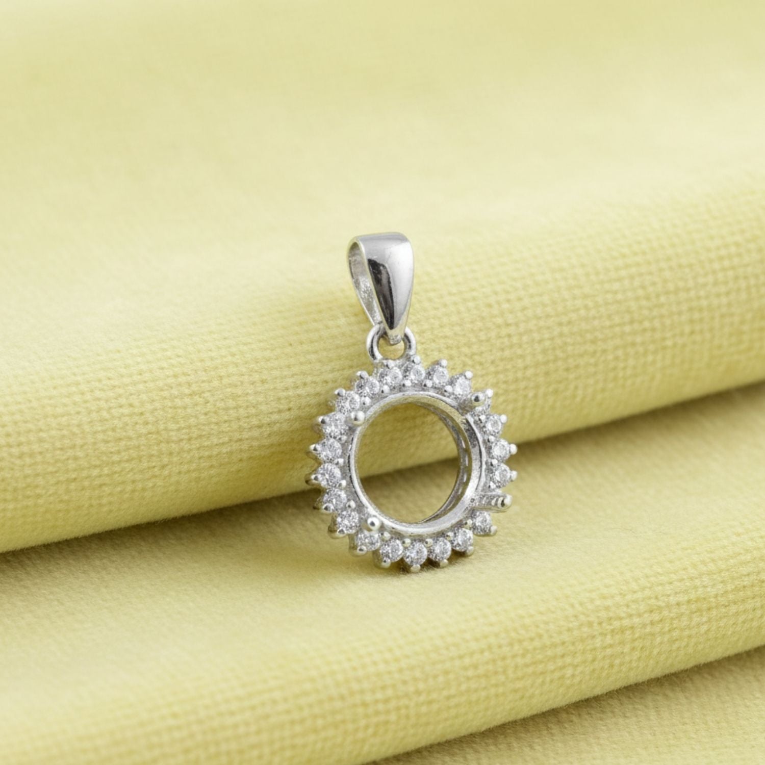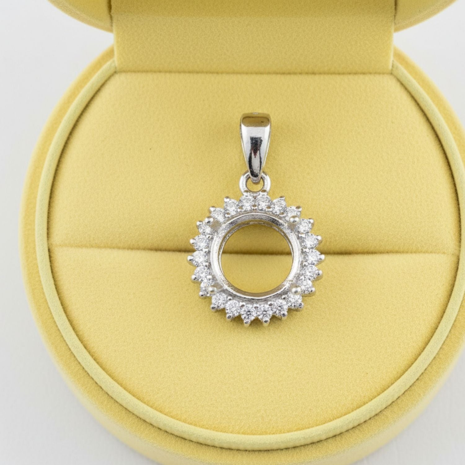 Showcase your gemstone in timeless elegance with this 18mm round semi mount pendant, expertly crafted in 925 sterling silver. The stunning halo-style border features shimmering accents that enhance brilliance and give your stone a luxurious spotlight.