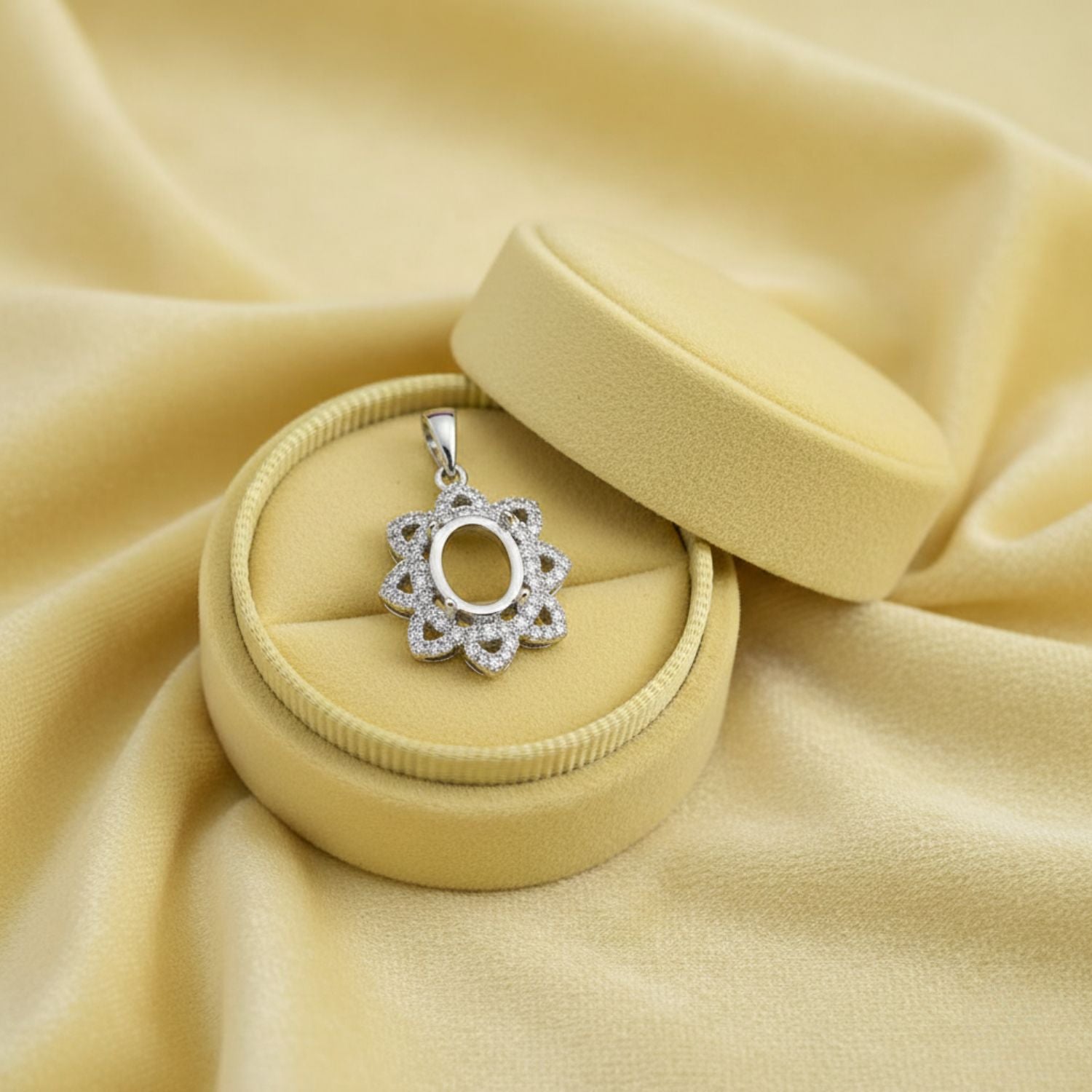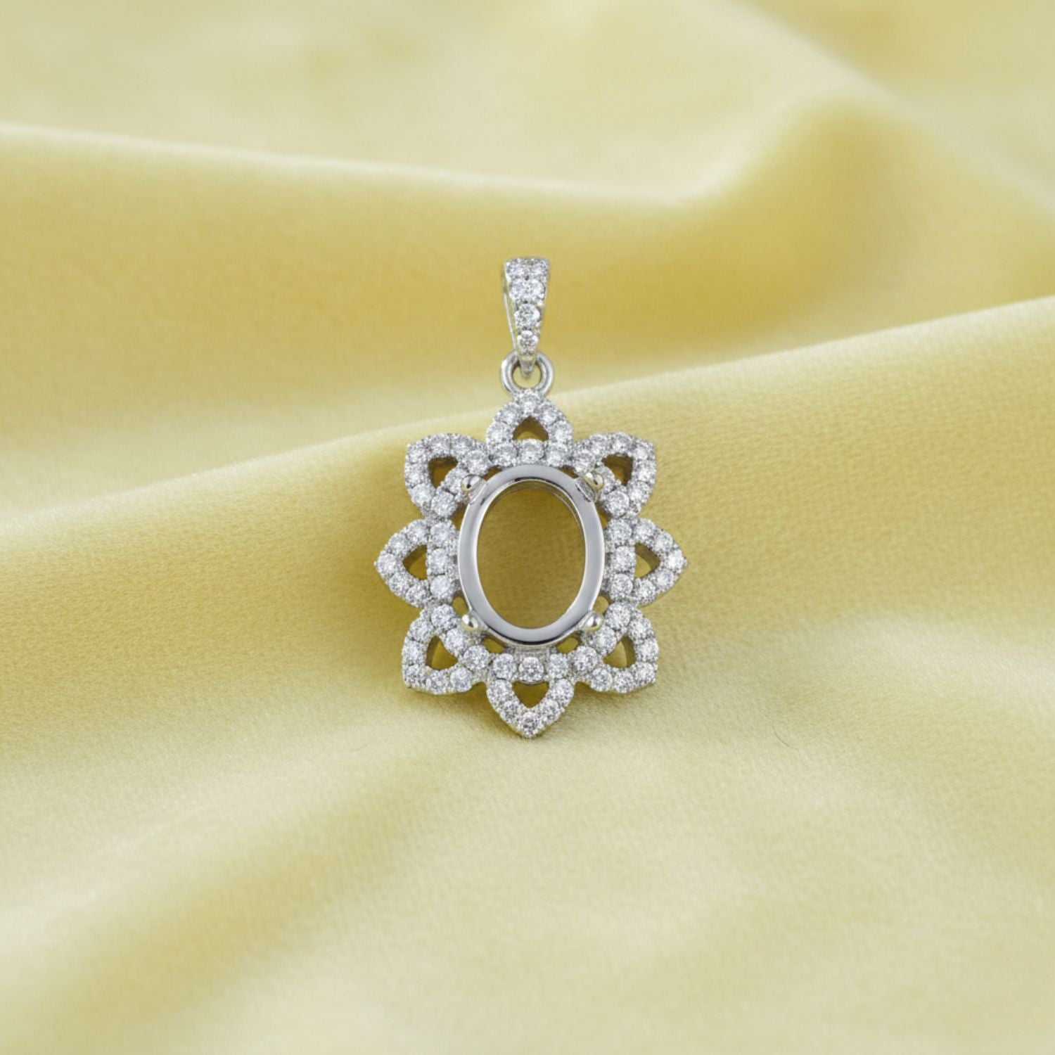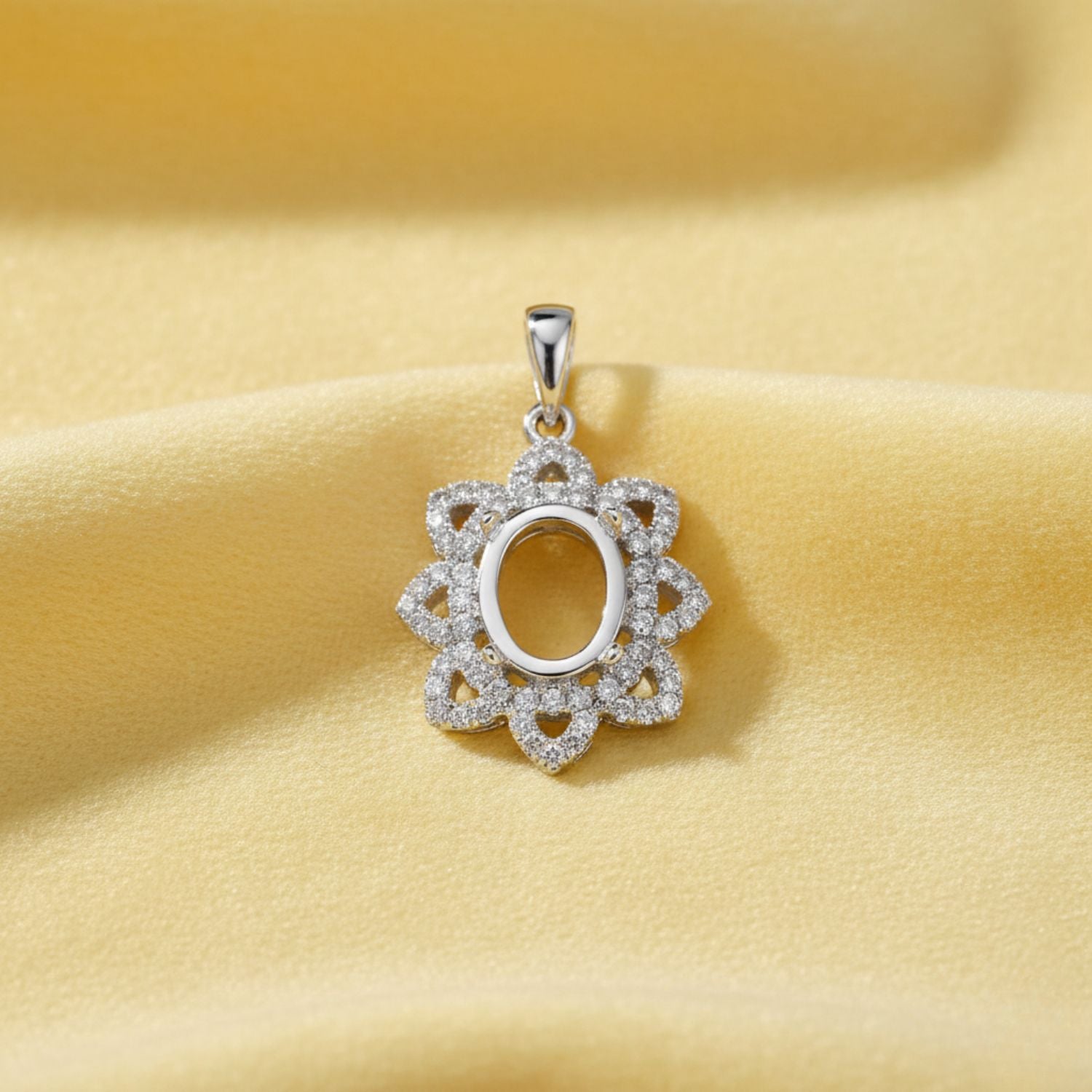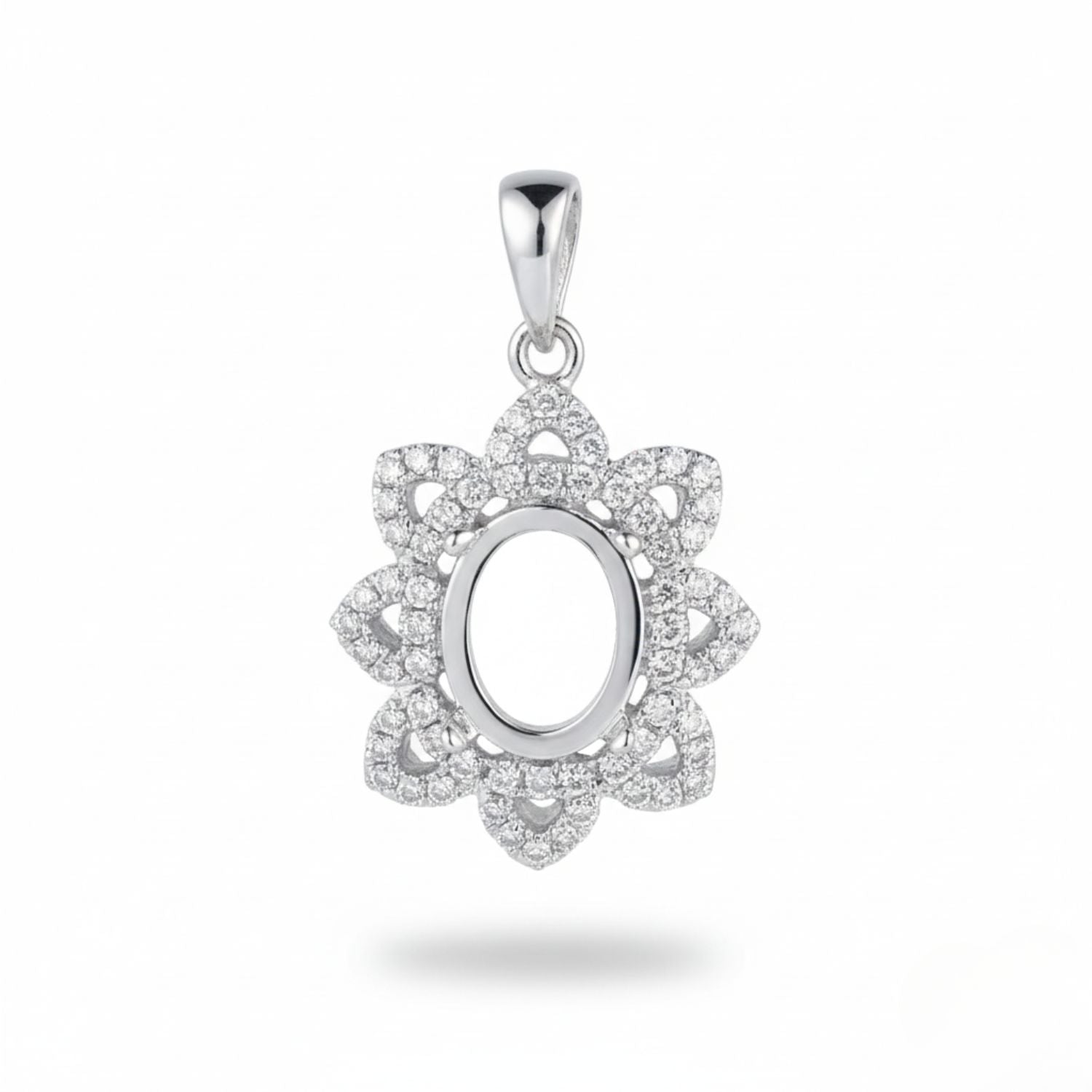 Elegantly designed in a sparkling floral halo, this 9x7mm oval semi mount pendant is crafted from high-quality 925 sterling silver and set with brilliant CZ stones. The intricate petal-style frame gives a luxurious, timeless look while perfectly showcasing your custom gemstone.