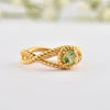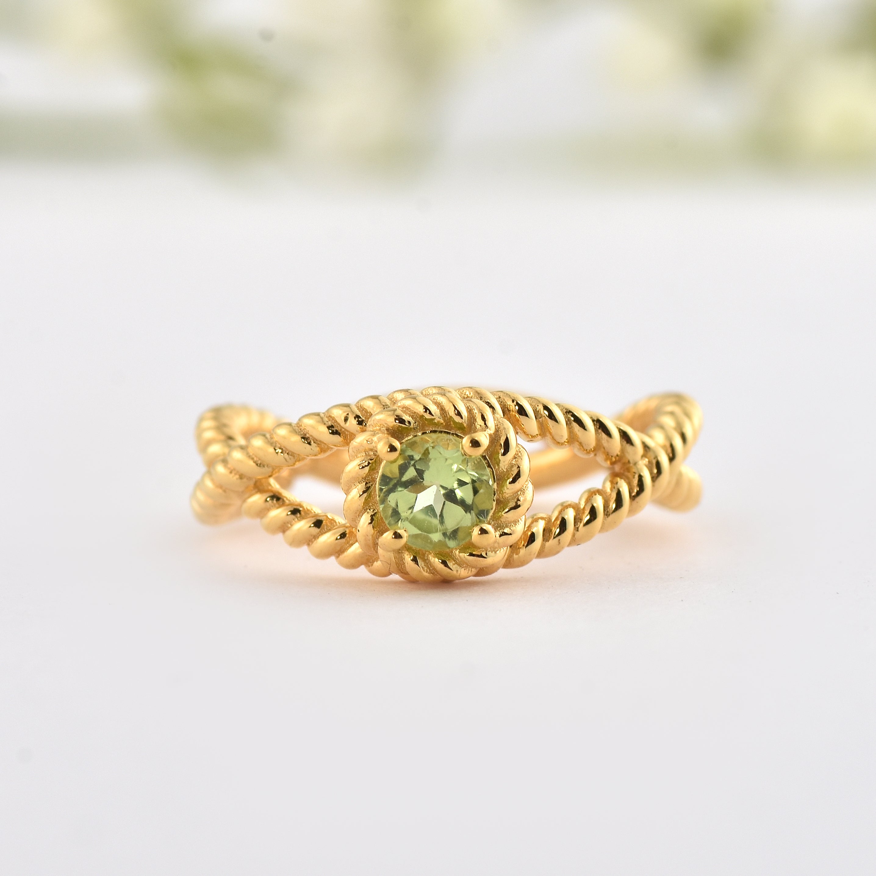 Bring a touch of charm and vibrancy to your jewelry collection with this beautiful gold-plated ring, featuring a 4x4mm round-cut peridot at its center. The twisted rope design of the band adds texture and a vintage-inspired feel, perfectly complementing the fresh green sparkle of the peridot. Ideal for stacking, everyday wear, or as a unique gift.