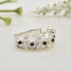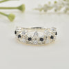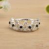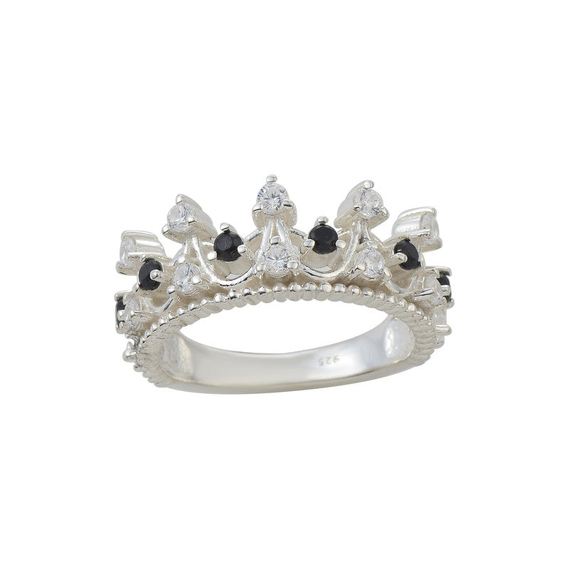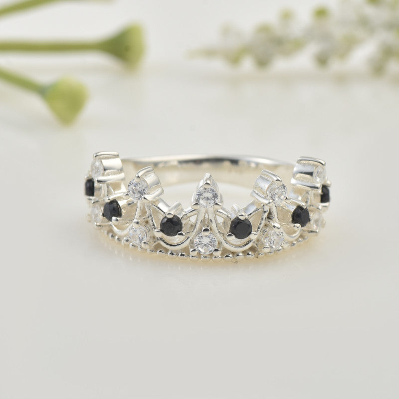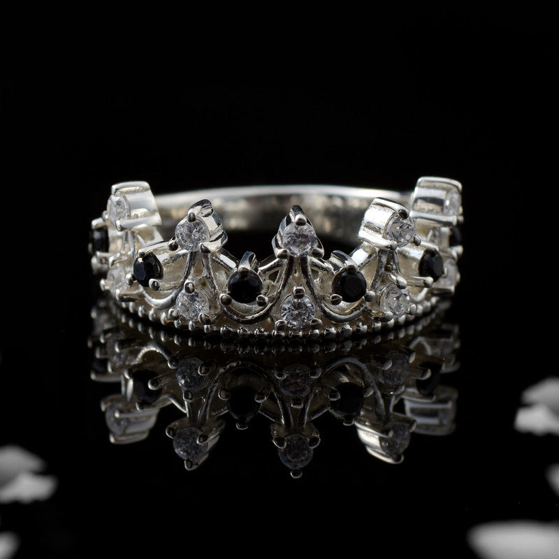 This regal crown-inspired ring is crafted in sterling silver and adorned with alternating 2x2mm round black spinel stones and sparkling cubic zirconia. Its intricate detailing and raised crown design make it a bold yet elegant statement piece. Perfect for those who love unique, gothic, or royal-inspired jewelry, this ring adds a touch of sophistication and individuality to any look.