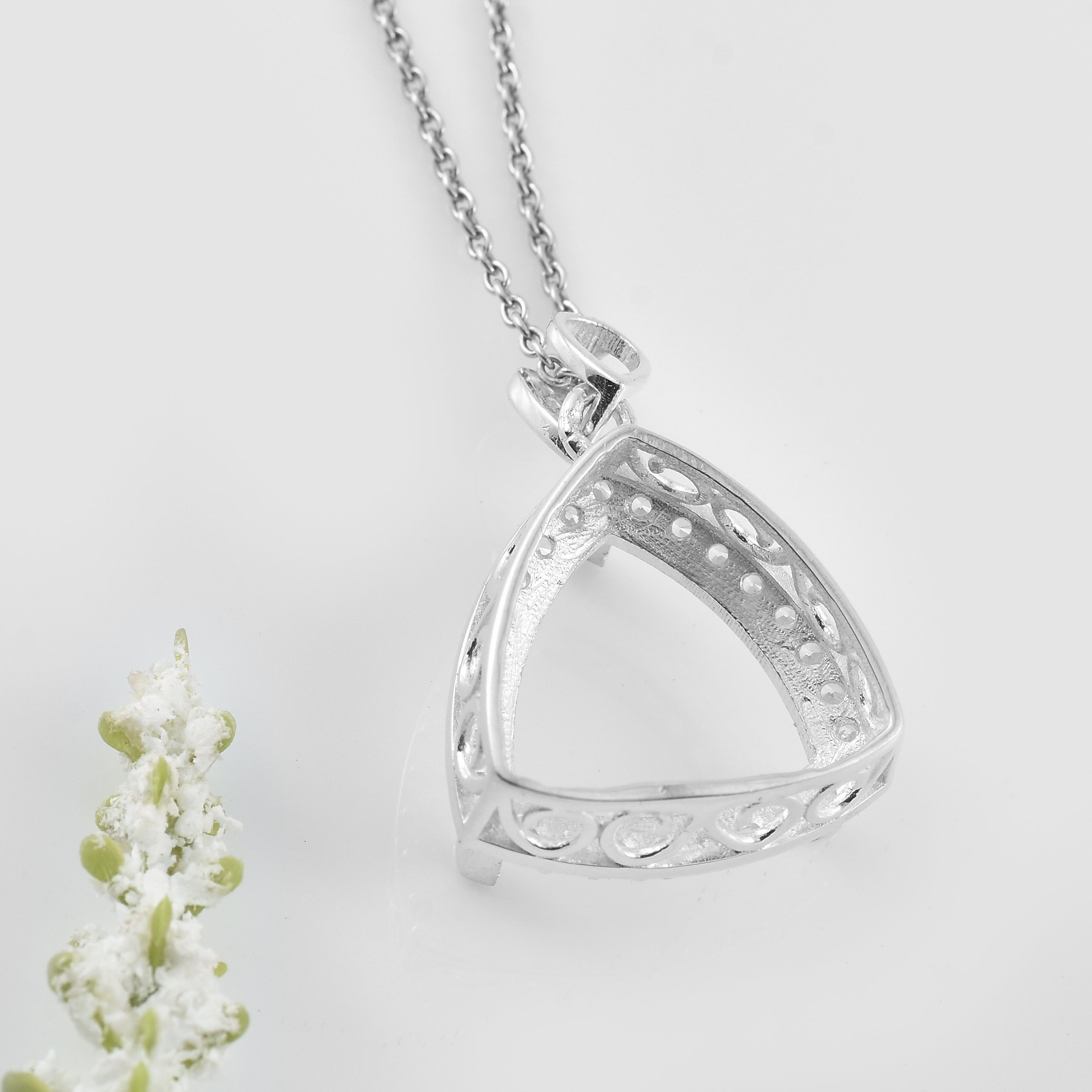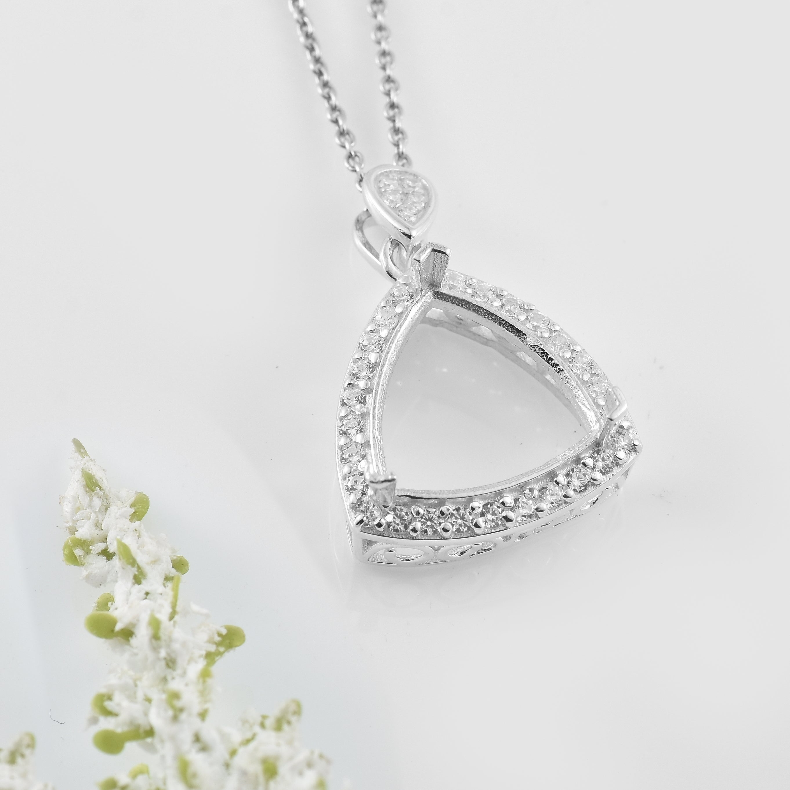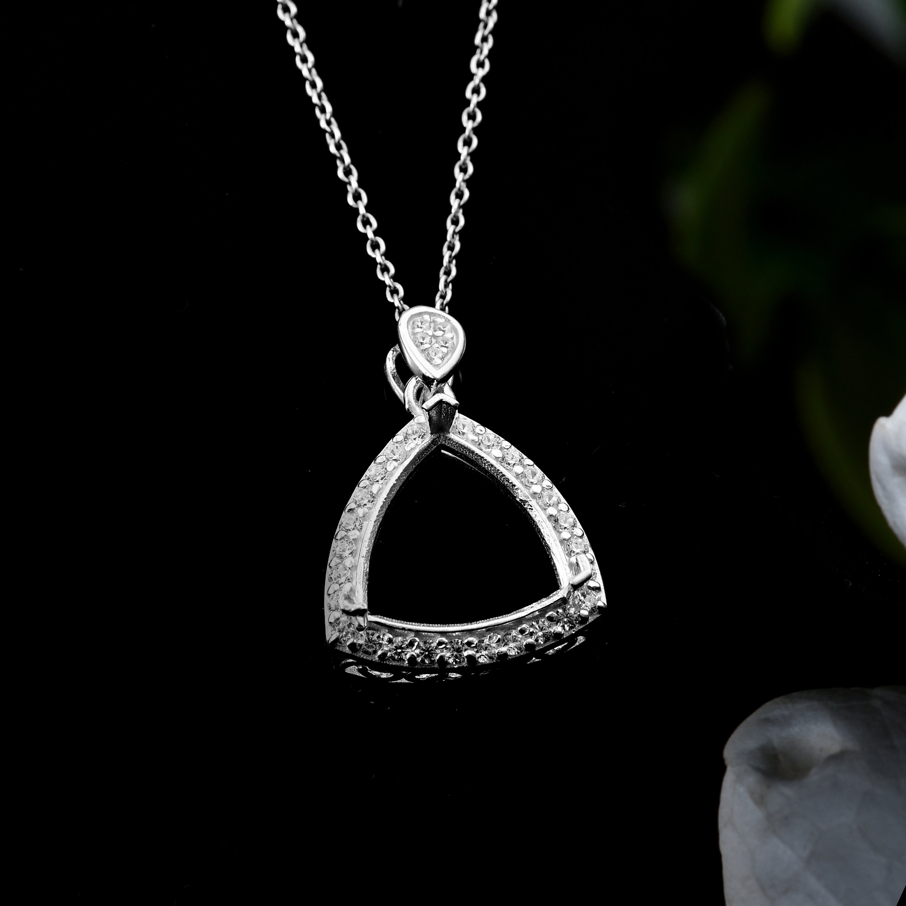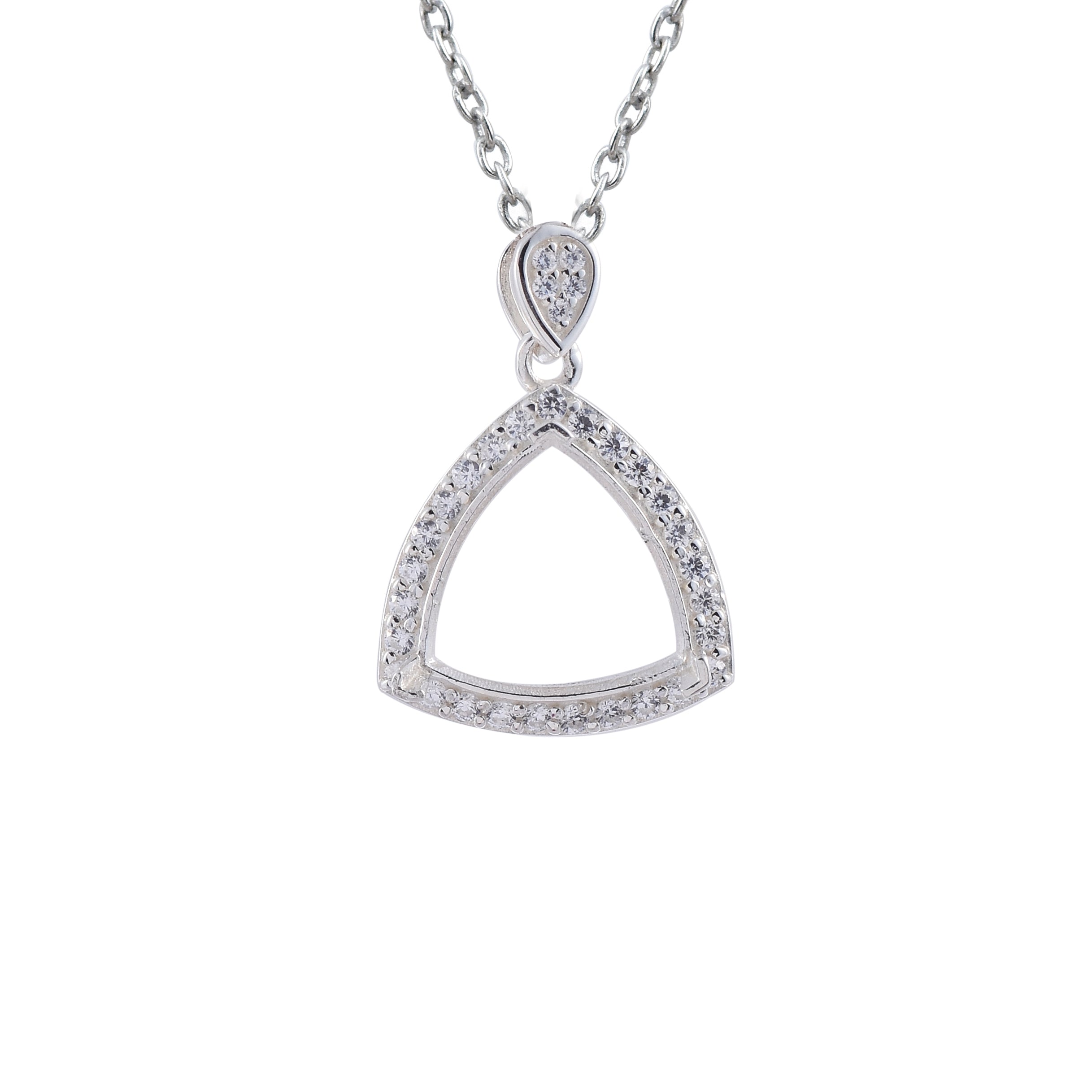 Showcase your unique taste with this contemporary trillion-shaped semi-mount pendant crafted from premium 925 sterling silver. Designed to hold a 13x13MM trillion-cut gemstone (not included), this pendant features a brilliant halo of sparkling CZ stones around the open frame. The pendant is suspended from a petite pear-shaped bail studded with CZs, adding an elegant finishing touch. Whether you're setting a custom birthstone or creating a statement look, this pendant is a bold yet refined choice.