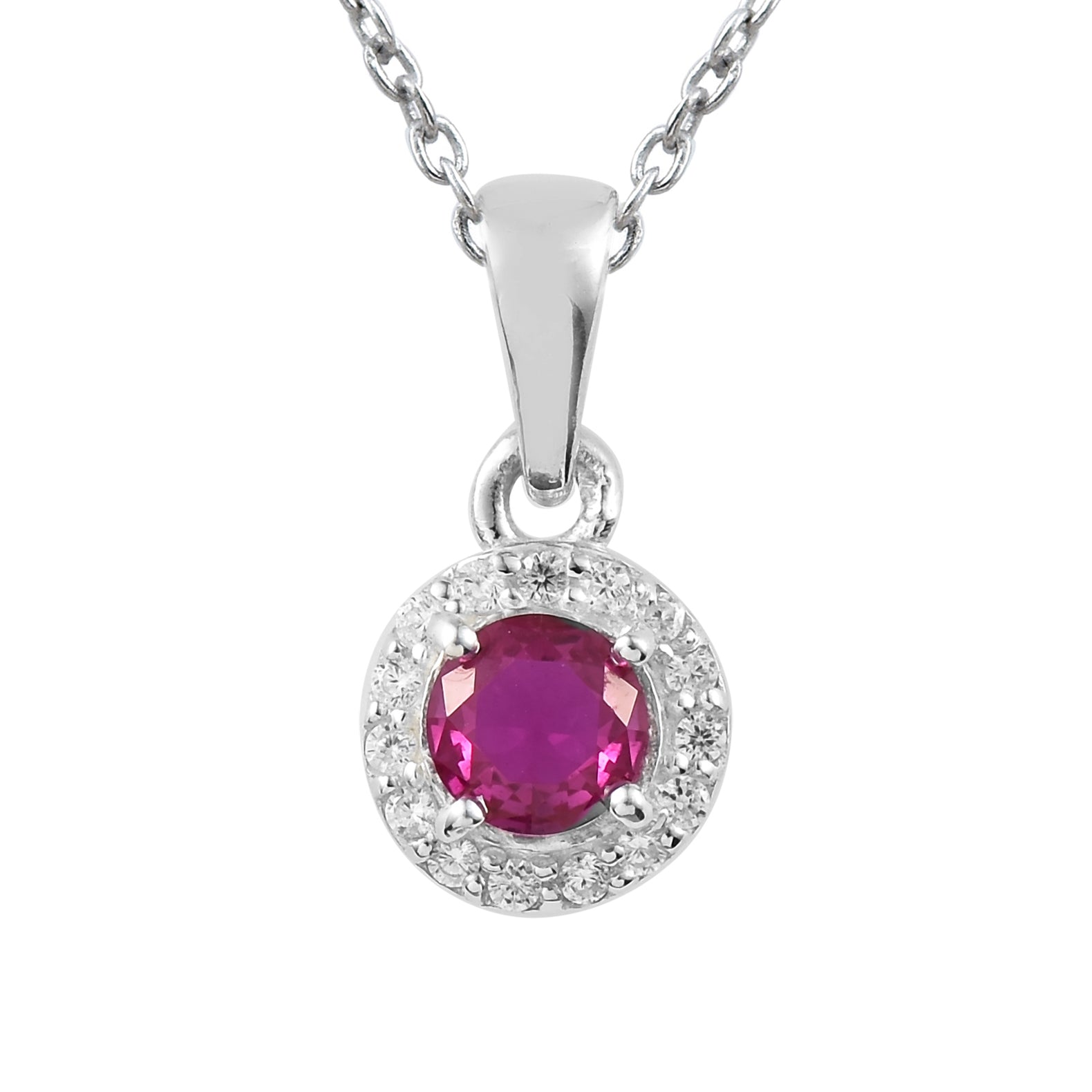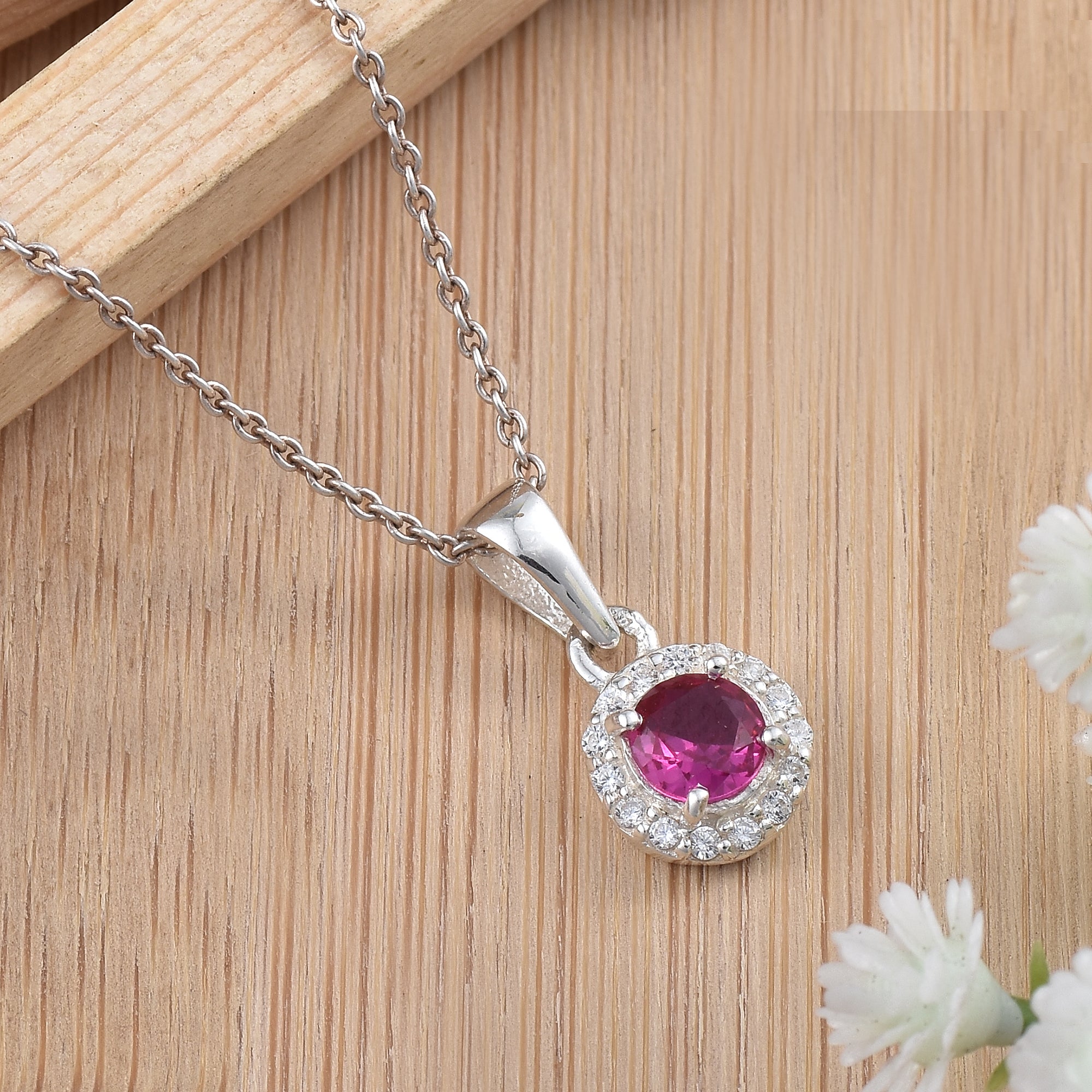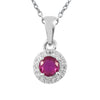 This timeless pendant showcases a 5x5mm round natural ruby, encircled by a halo of shimmering cubic zirconia set in solid 925 sterling silver. The brilliant red ruby offers a vibrant pop of color, while the halo design enhances its sparkle, making it perfect for special occasions or everyday sophistication. The pendant comes with a sleek sterling silver chain that complements its classic style and ensures comfortable wear.